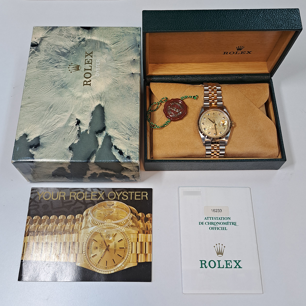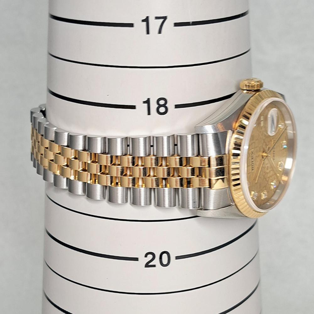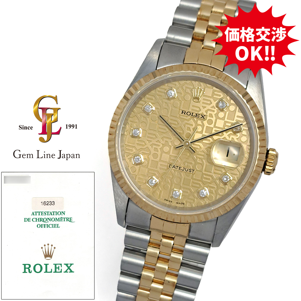 商品名 | ロレックス デイトジャスト 16233G W番 シャンパンゴールド 彫コン 10P純正ダイヤ 並行ギャラ付 メンズ 自動巻 時計 | ||