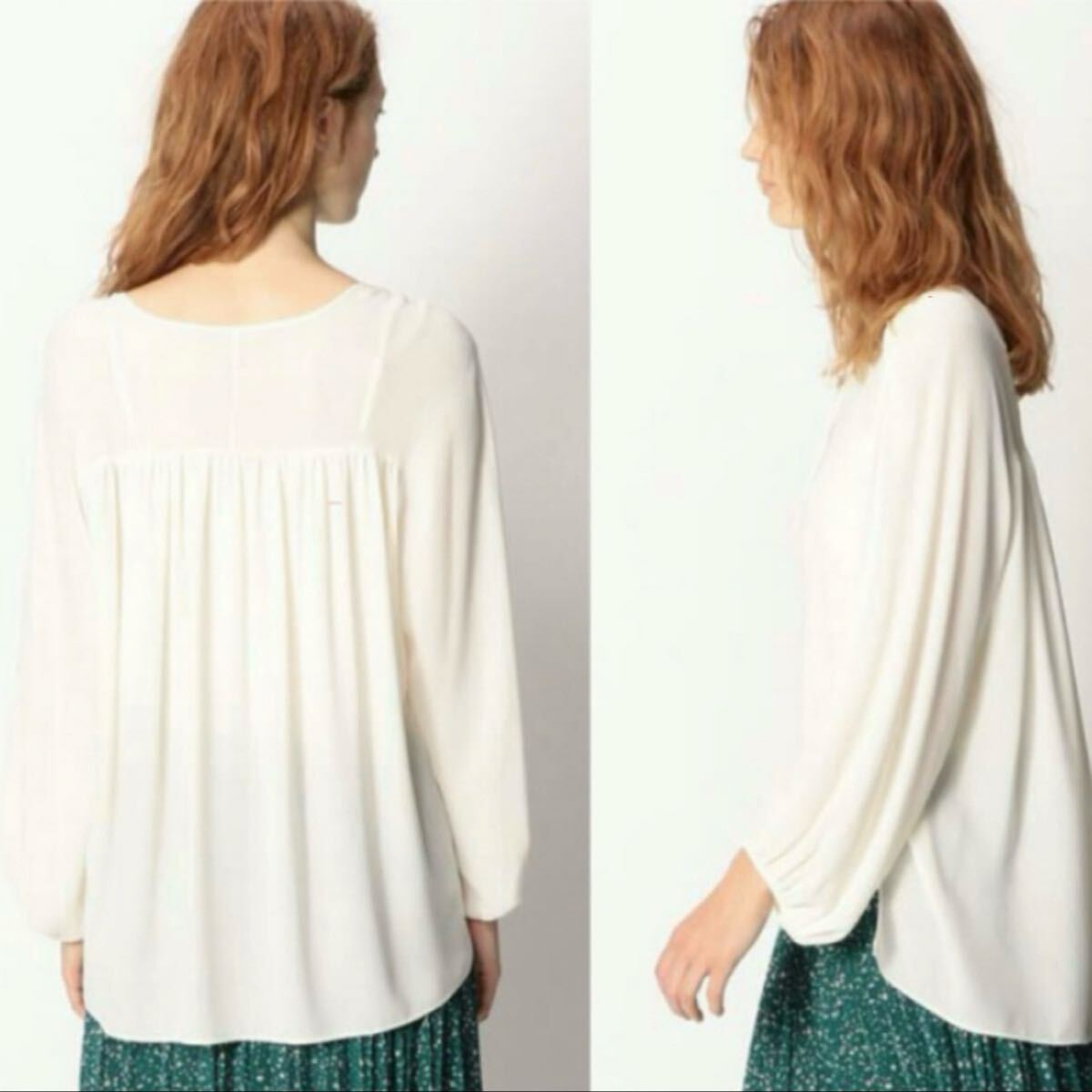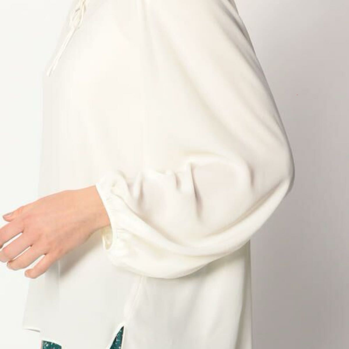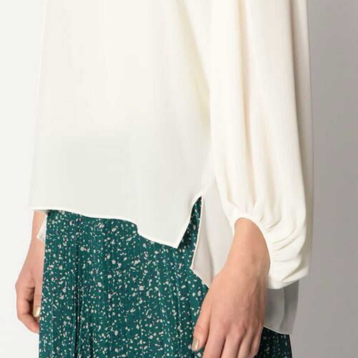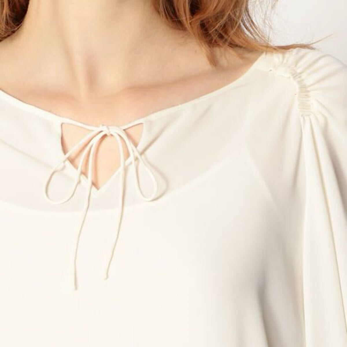 しっとりとしたきめ細かな表面感と落ち感が美しいポリエステルのシフォンジョーゼット ボリュームスリーブブラウスです