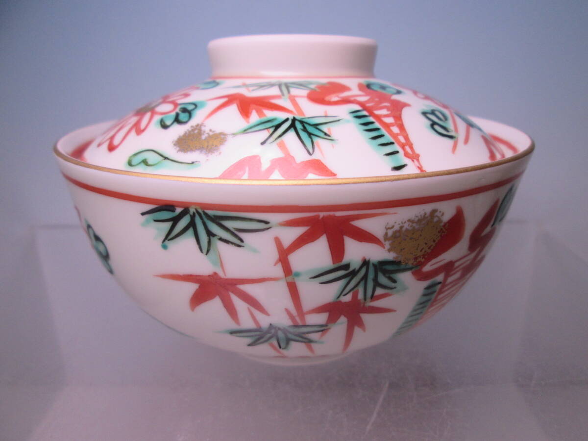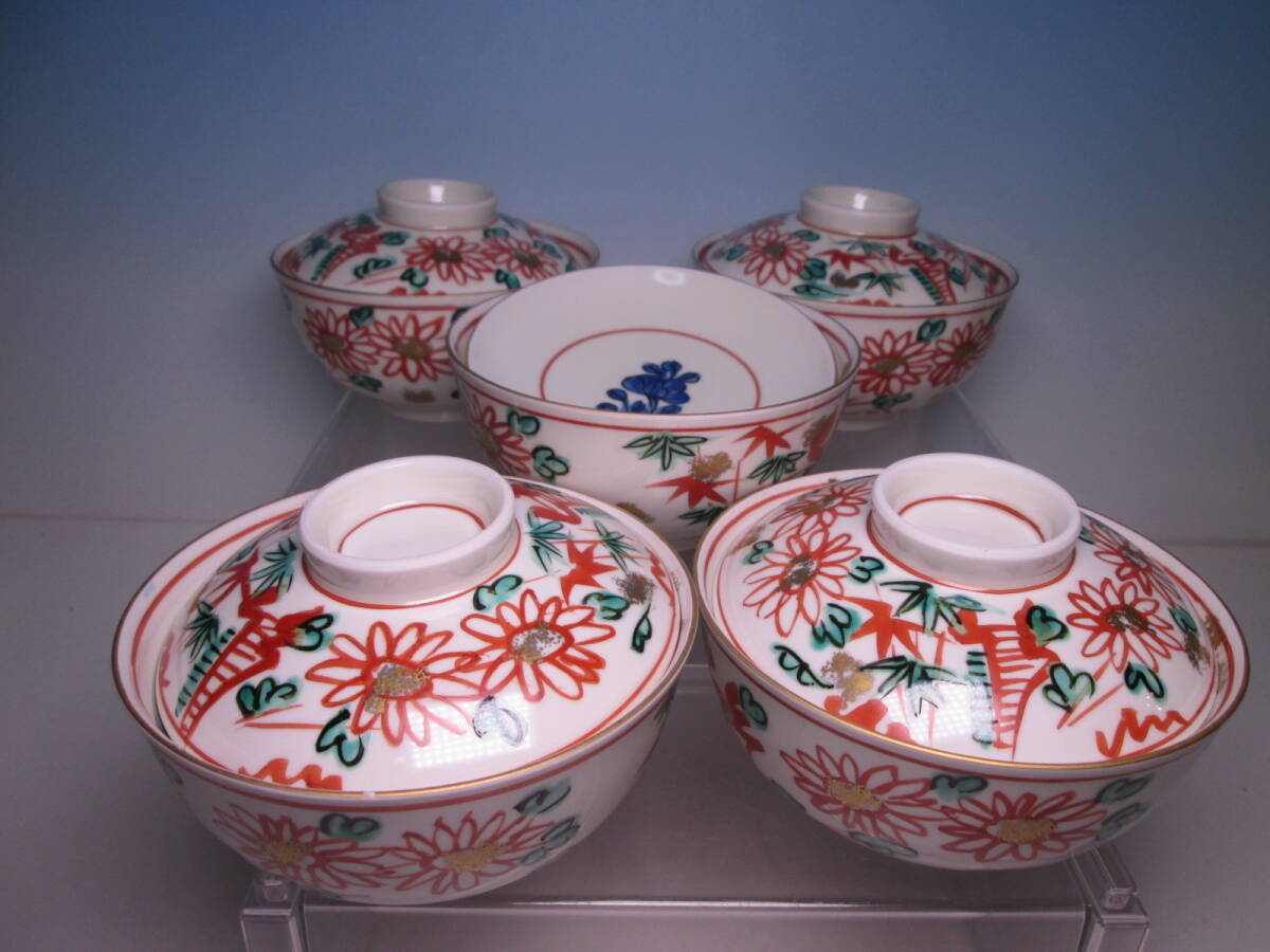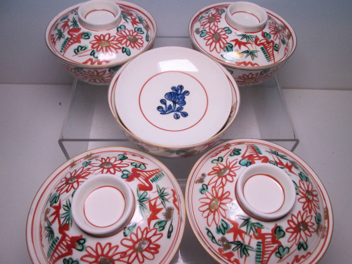 ☆お料理屋さんの器 色絵金彩 笹竹に菊花文 蓋向付 五客 箱無し 蓋茶碗/懐石/割烹/日本料理