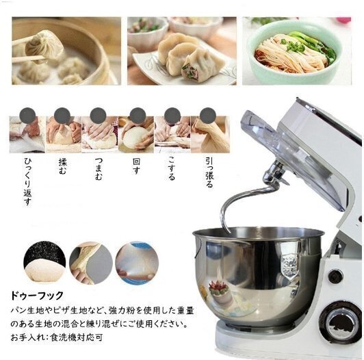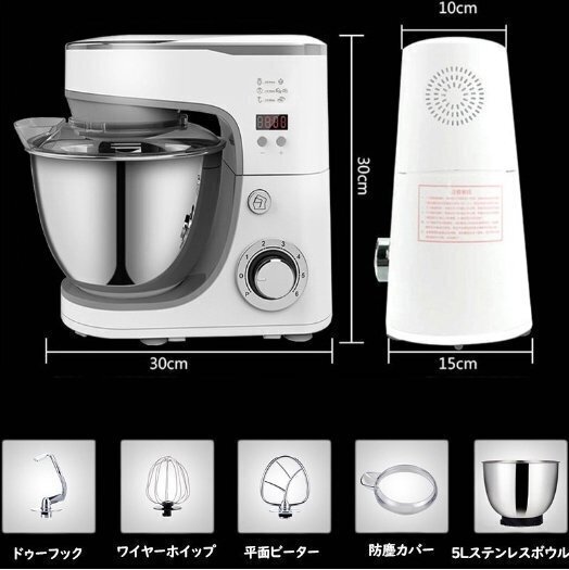 付属品:付属品:ステンレスボゥル5L、ドゥーフック、ワイヤーホイップ、平面ビーター、防塵カバー、英語取扱説明書(日本語明書は当店にお問い合わせください。)