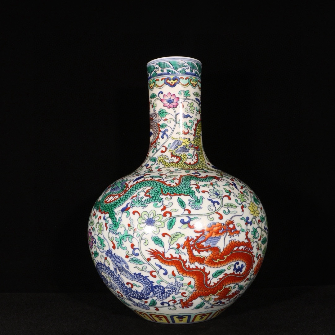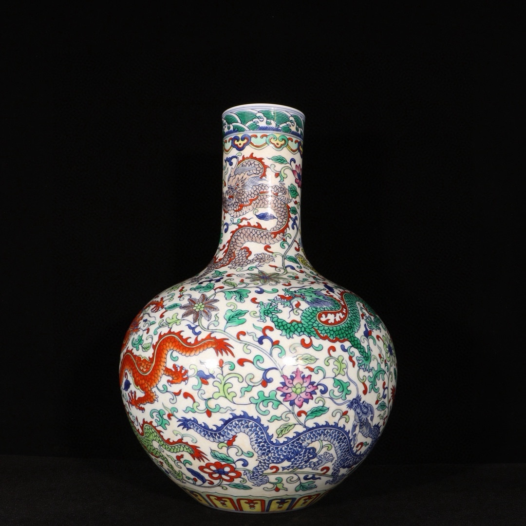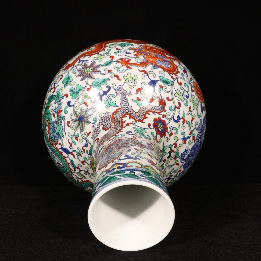 時代旧蔵 清時代 雍正年製 闘彩絡枝 花卉龍紋 天球瓶 古陶磁器 高さ41.5 cm 長さ28.5 cm 珍品旧蔵 古賞物 時代物 819