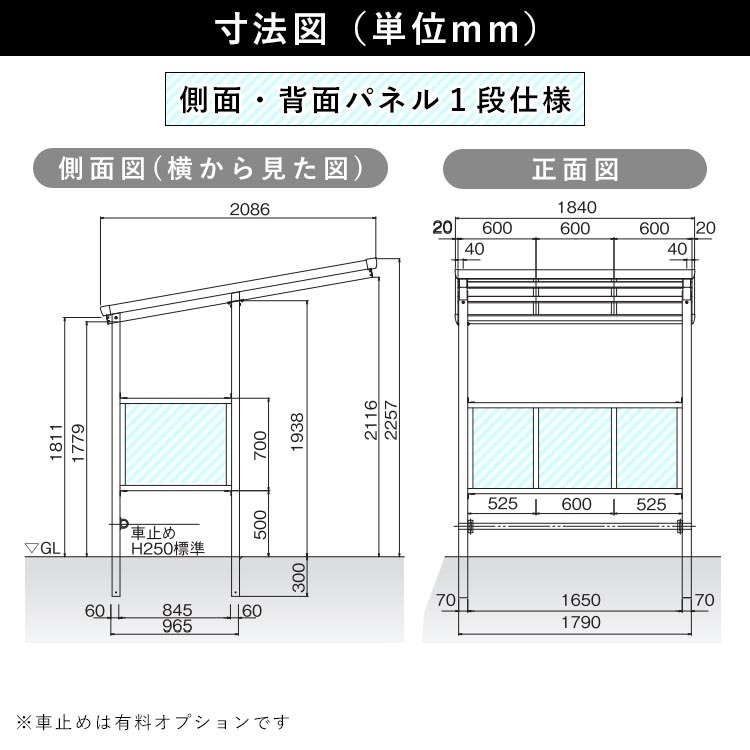 ※自転車収容台数は、自転車の間隔を約600mmで計算した台数です ▽ 側面、背面パネル