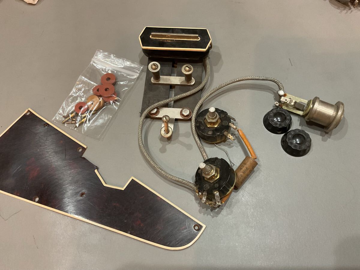 エレクトリック黎明期 オリジナルギブソン ES-150のチャーリークリスチャンピックアップです。ベークライトノブやオリジナルキャパシター ジャック 加工されたピックガードセットです。黄金期のジャズのサウンドが欲しい方やデザインに惚れた方 ES-250やES-350 l-5などにも