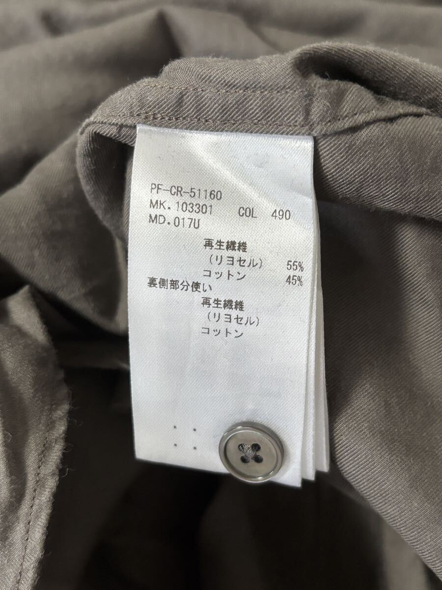 カラーは深みのあるカーキ系。都会的な渋みとナチュラルな雰囲気を兼ね備え、どんなコーディネートにも馴染みやすいのが魅力です。素材はリヨセル55%、コットン45%の混紡生地を採用。リヨセル特有の柔らかさと落ち感に加え、コットンのナチュラルな風合いが組み合わさり、軽やかで通気性がよく、肌触りの良い着心地を実現しています。正規品タグも付いており、信頼性の高い一点です。
