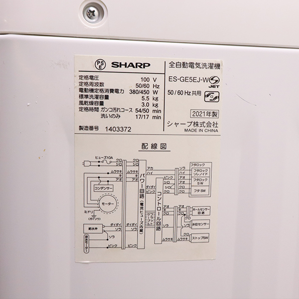 【中古】洗濯機/シャープ/一人暮らし/5.5kg/コンパクト/風乾燥/送料込み特価品/2021年式/ES-GE5EJ-W/SB-ESGE5EJW