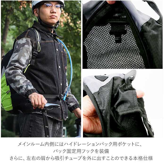 | 商品説明 | ・自転車競技やアウトドアスポーツのパフォーマンスUPに!軽量で身体にフィットするサイクリングリュック。 ・リュックボディは撥水ナイロン+通気性に優れたメッシュ生地で仕上げ、背負っていることを忘れるほどの軽量設計。 ・メイン収納ルームはA4サイズに対応。長財布やタブレット、折りたたみ傘にレインコートもすっぽり入る容量16リットル。 ・メインルーム内側にはハイドレーションパック用ポケットに、パック固定用フックを装備。さらに、左右の肩から吸引チューブを外に出すことのできる本格仕様。(※ハイドレーションパックは付属しません。ハイドレーションパックとは、バックパック、ウエストバッグ内の袋に水を入れ、左右の肩から口許までのびるチューブによって給水する仕組みのこと。) ・チェストベルトとウエストベルトでリュックが身体にフィット。サイクリング中もズレにくく、競技のパフォーマンスが向上。 ・フロントの縦型ファスナーはスマホやコインケースの収納に便利。さらに、ウエストベルトのサイドファスナーポケットからは、カードや鍵がサッと取り出せる。(※スマートフォンのサイズによっては、収納できない場合もございます。) ・リュック背中部分やベルトにはメッシュ生地を使用し、スポーツ中に汗をかいてもムレずに快適。 ・脱いだサイクルヘルメットを掛けておける、ヘルメット固定ホルダー付き。 ・リュックフロントやショルダーベルトなど、随所に夜間も安全にトレーニングできる反射素材を配置。 ・サイクリングはもちろん、トレイルランニングや登山、ジョギングなどにもオススメ。 |