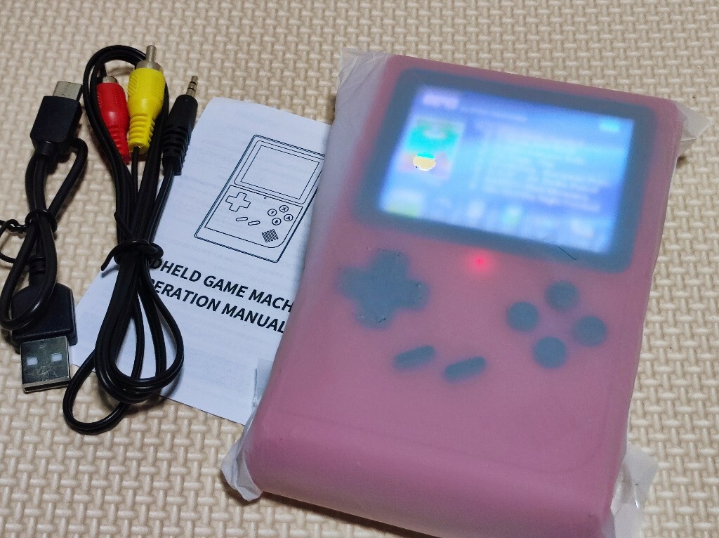 英文の説明の紙とAVケーブルと充電用USBケーブルが付属します