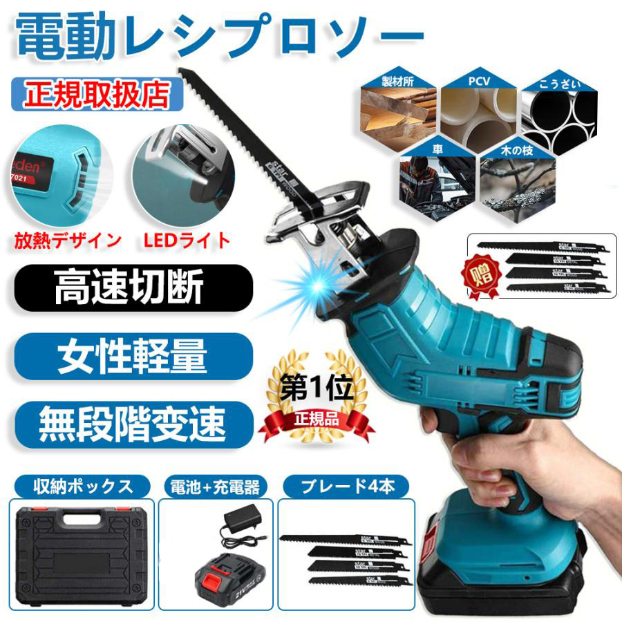 レシプロソー 充電式 電動ノコギリ 充電式 コードレス 21V 無段変速 金属切断 木工切断 軽量 マキタバッテリー併用 ブレード4本付き