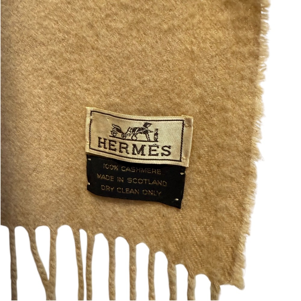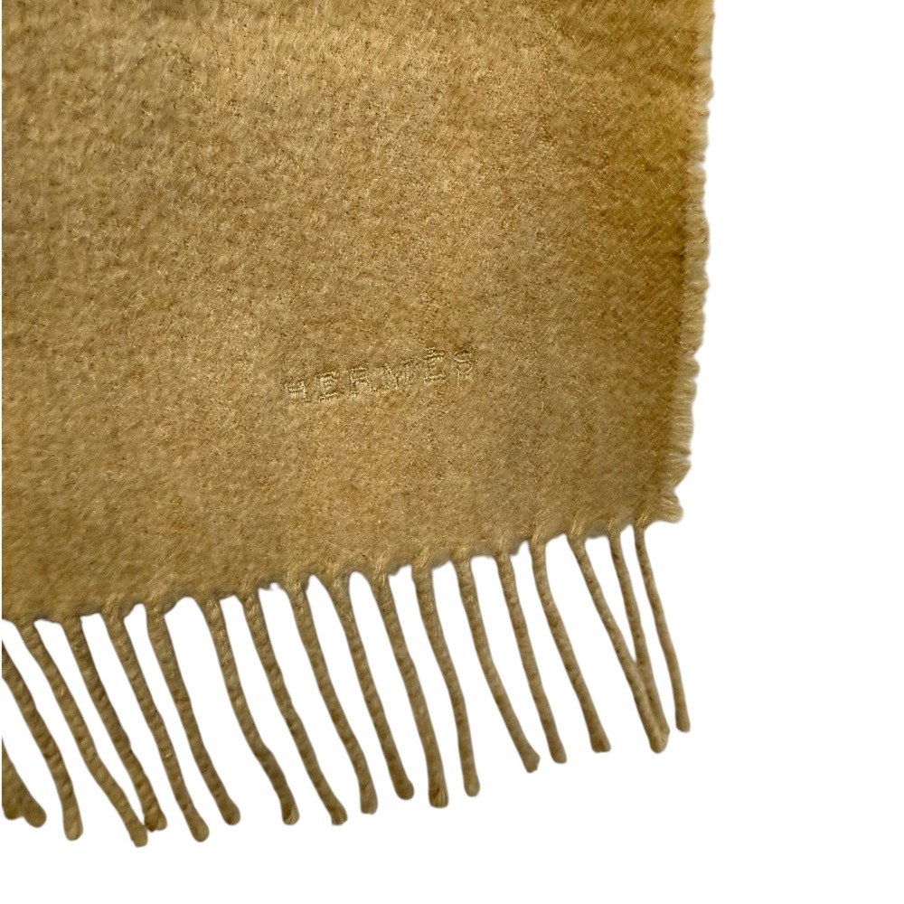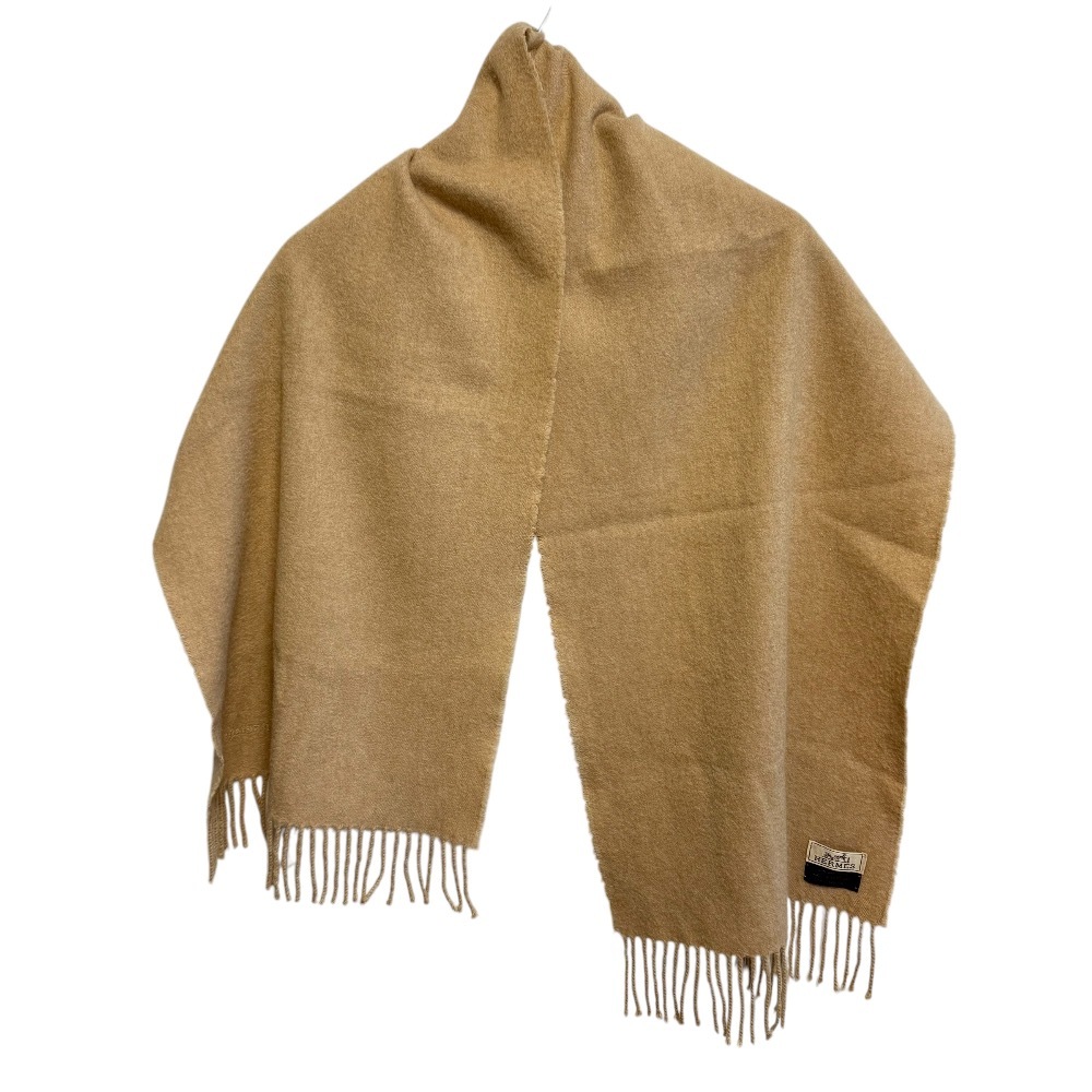 良品 HERMES エルメス カシミヤ100% ロゴ刺繍 フリンジ マフラー ブラウンベージュ