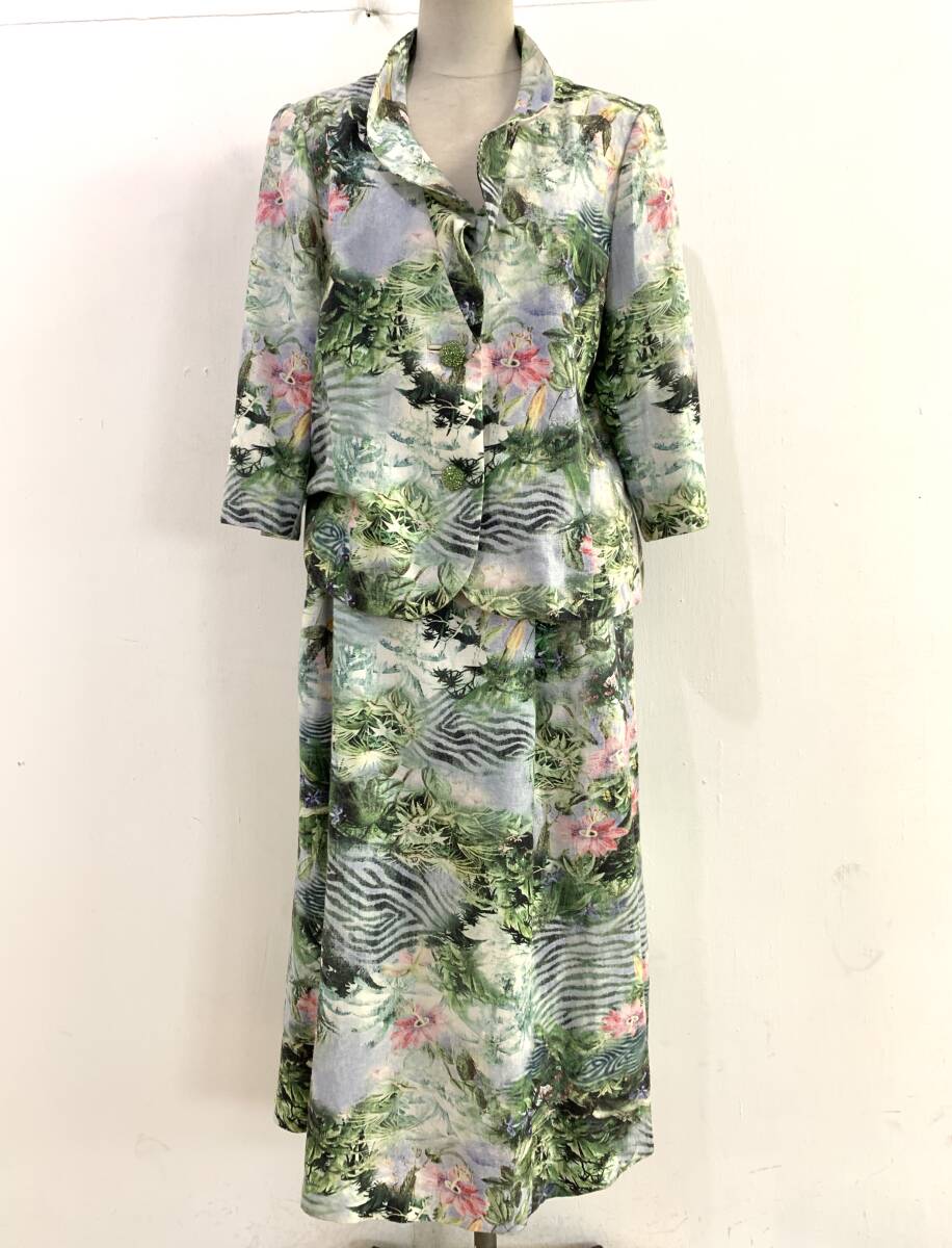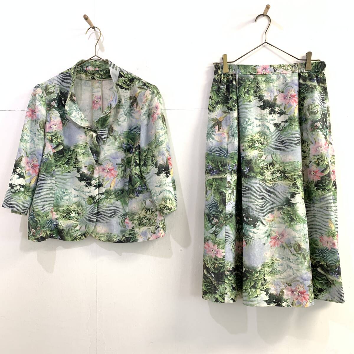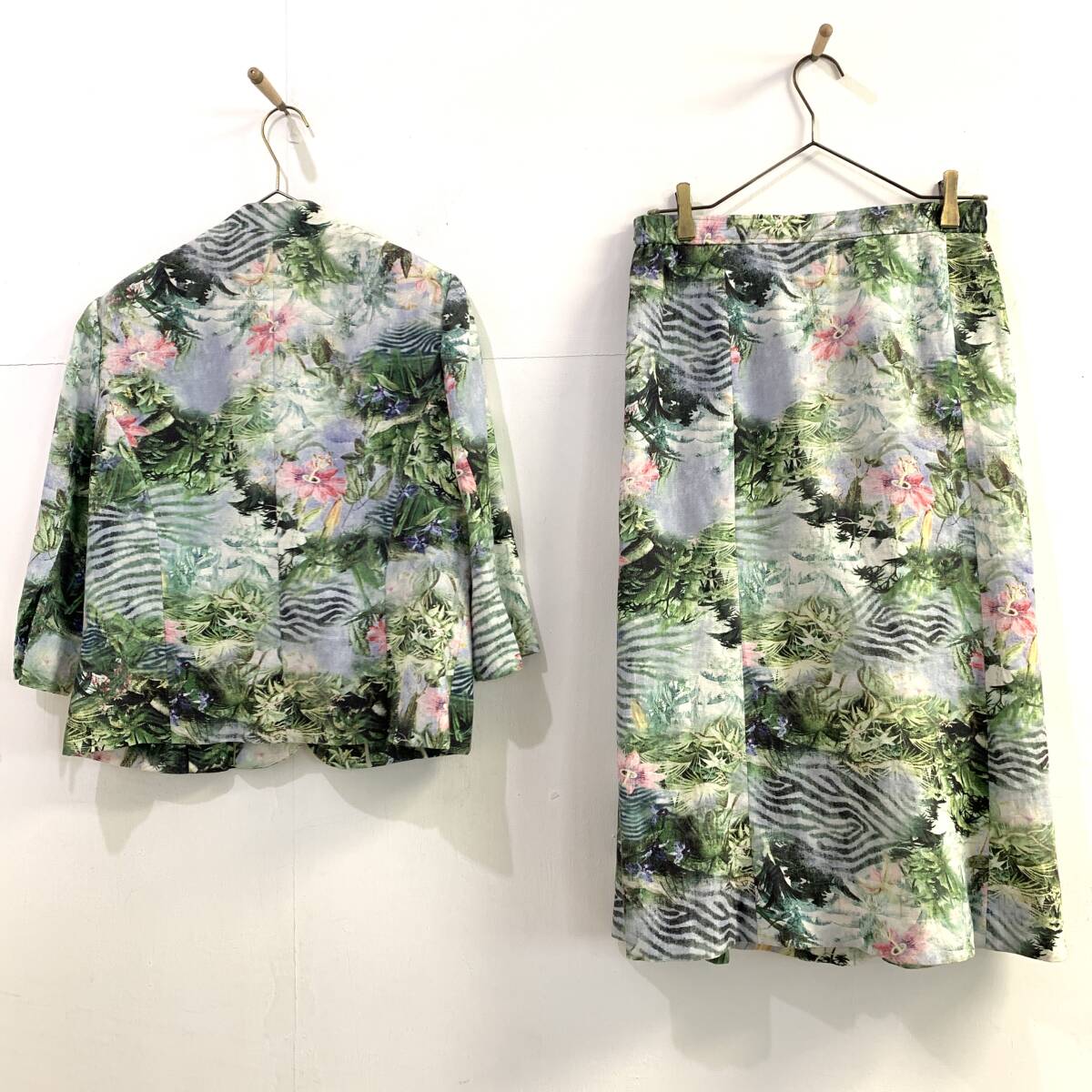 ☆リメイク ハンドメイド 1点物 総柄 ボタニカル柄 セットアップ 上下 ジャケット スカート 昭和レトロ 古着【送料一律/同梱可能】F