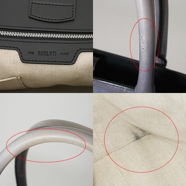 備考:角や縁にスレ、表面レザーに微細な汚れ、ハンドルに傷や使用感、内側にキャンバスの汚れが見られます。大きく目立つような傷はなく、今後も十分にご活躍いただけるお品物となっております。