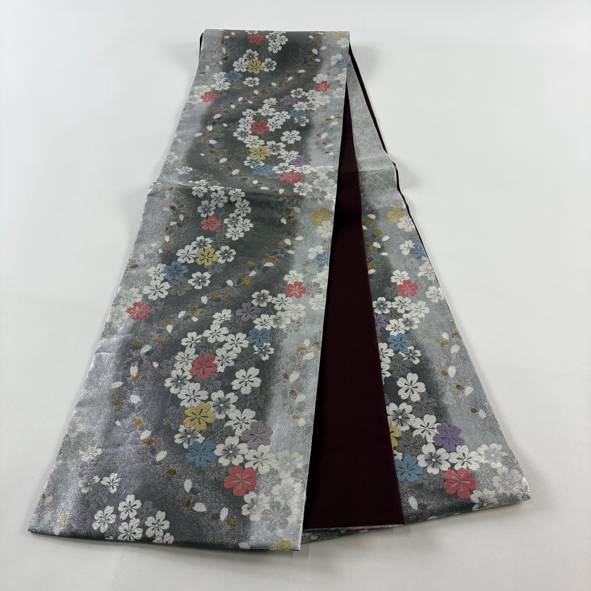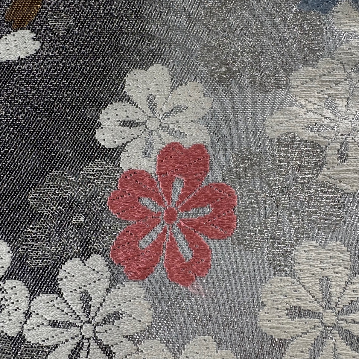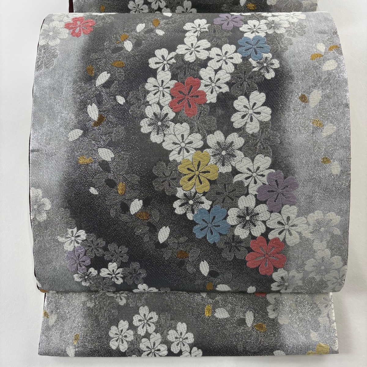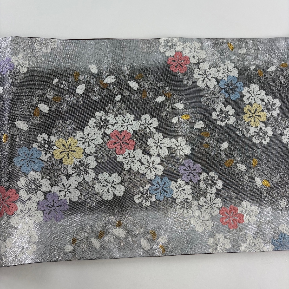 | 袋帯 秀品 鈴乃屋 振袖向き 桜 花びら 銀糸 箔 銀色 六通 正絹 【中古】 |