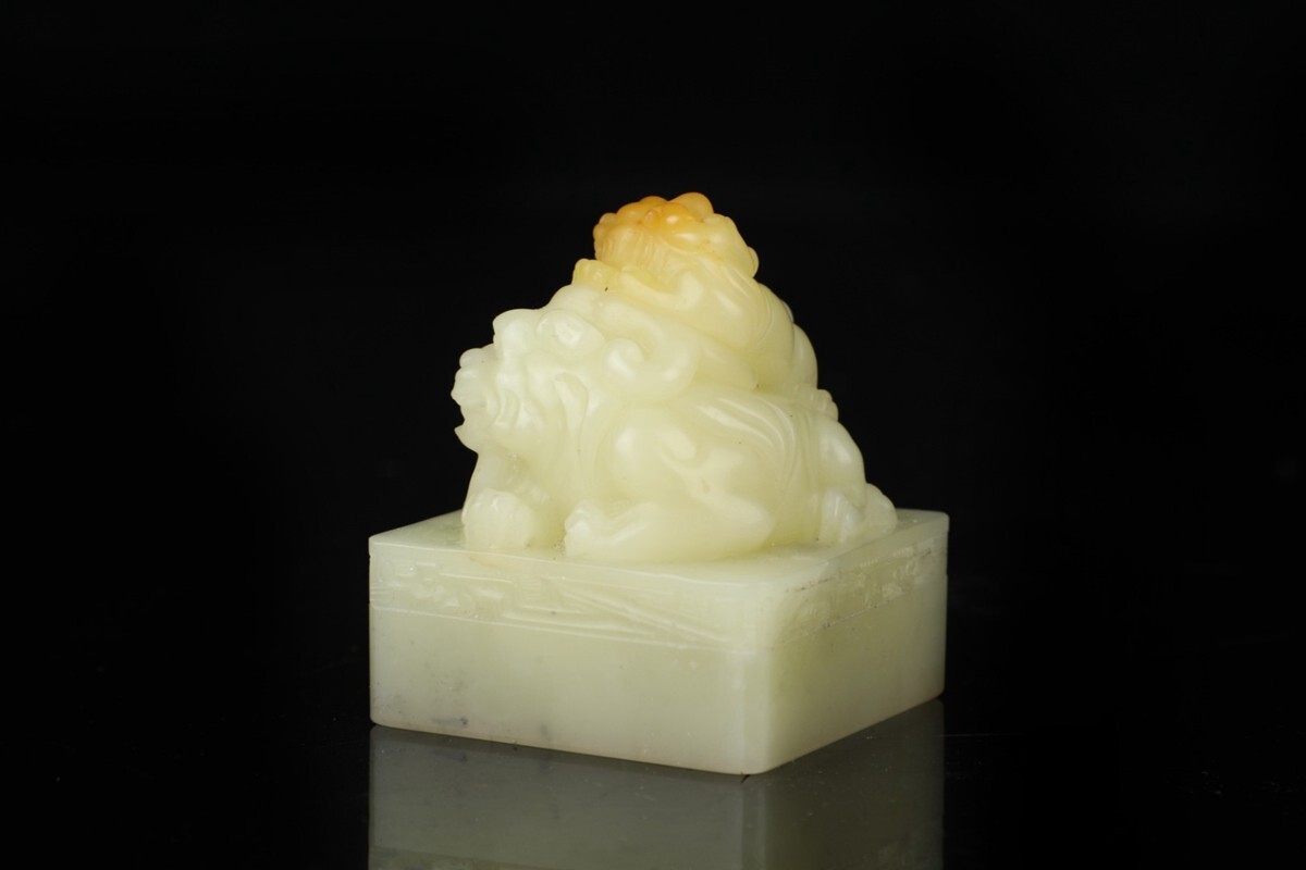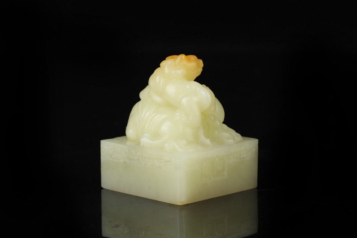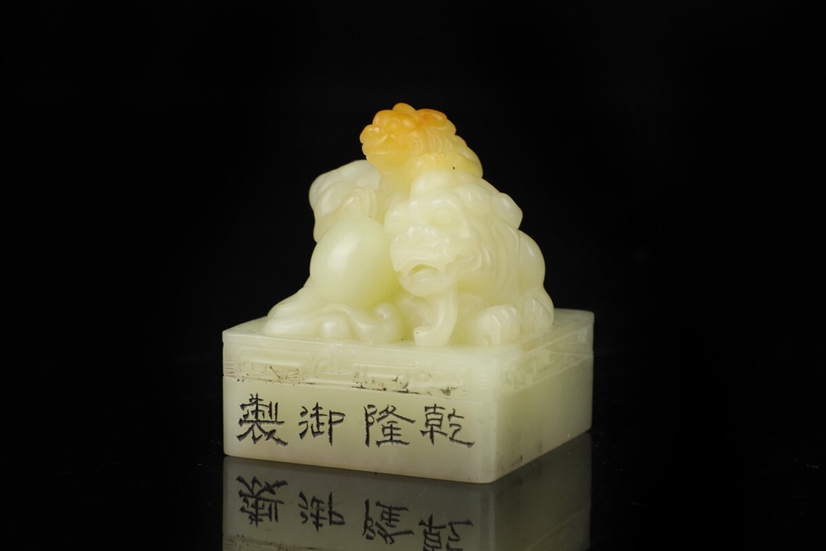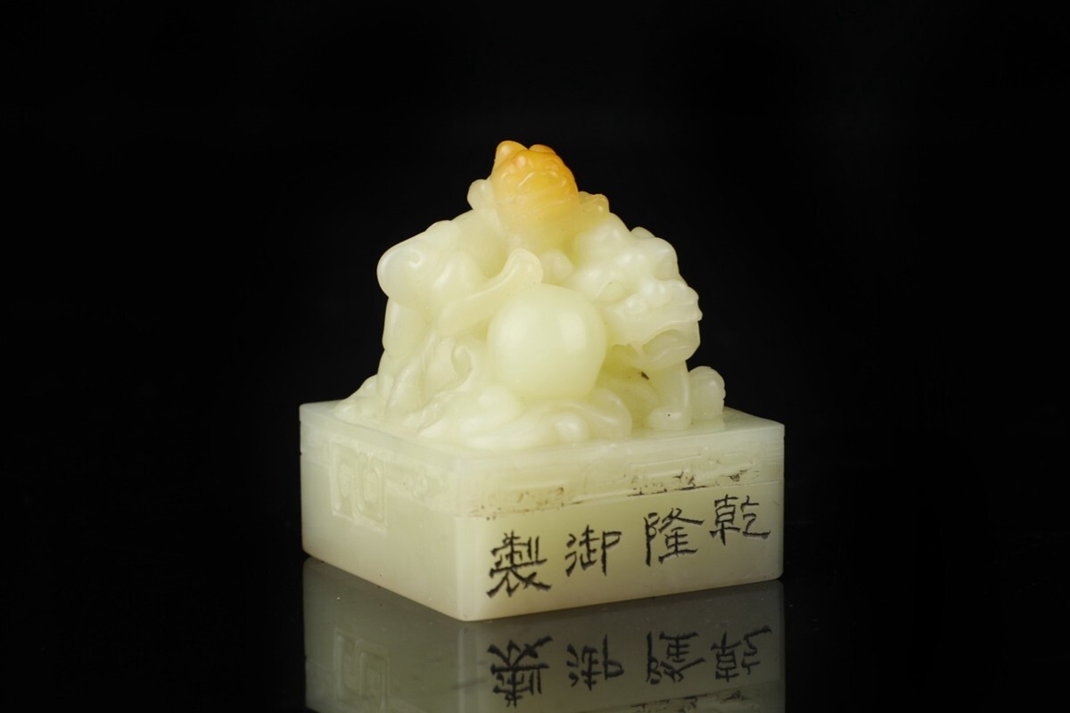 「清 乾隆御製 老寿山石 白田黄石彫り 事事如意鈕印章」極細工 擺件 古賞物 中国古美術 旧蔵出