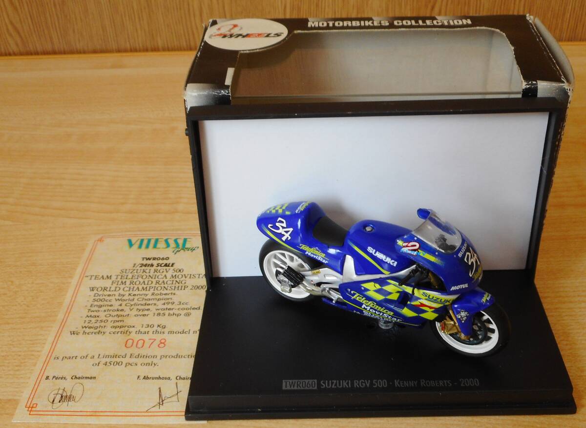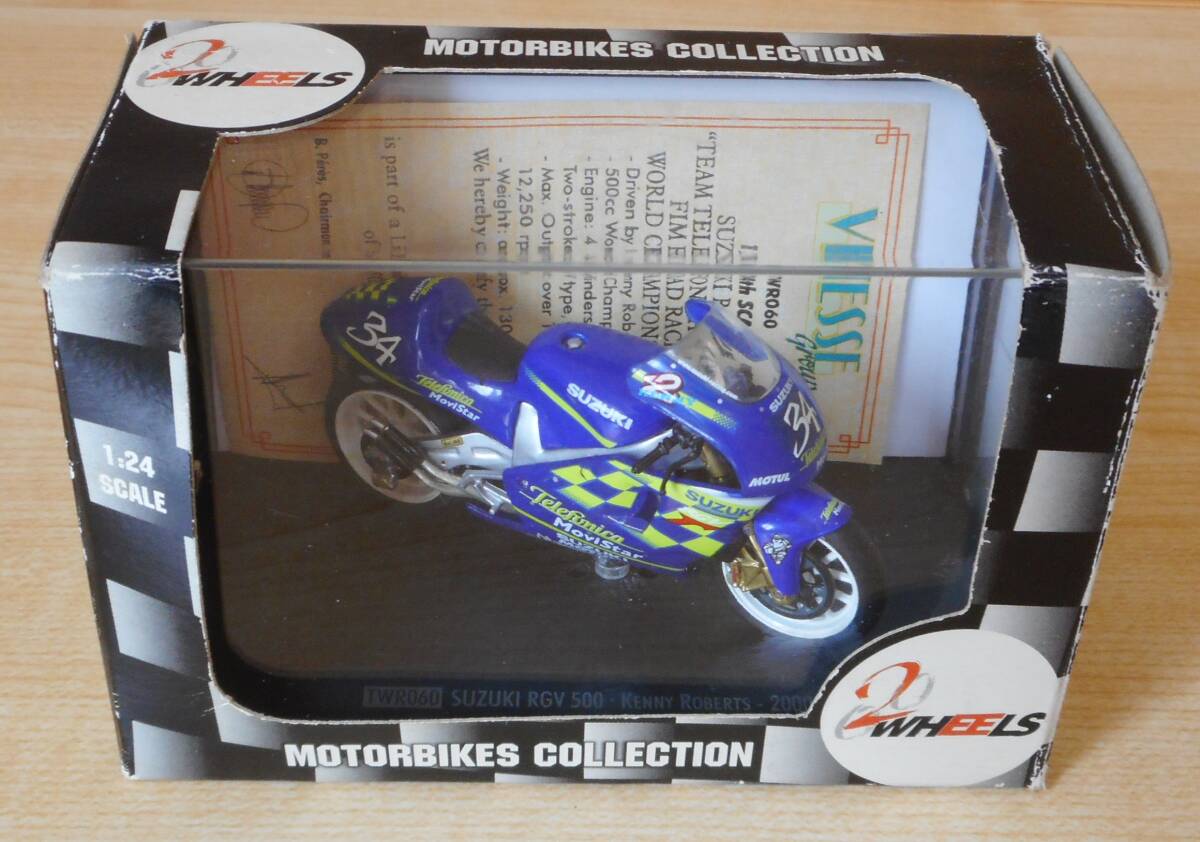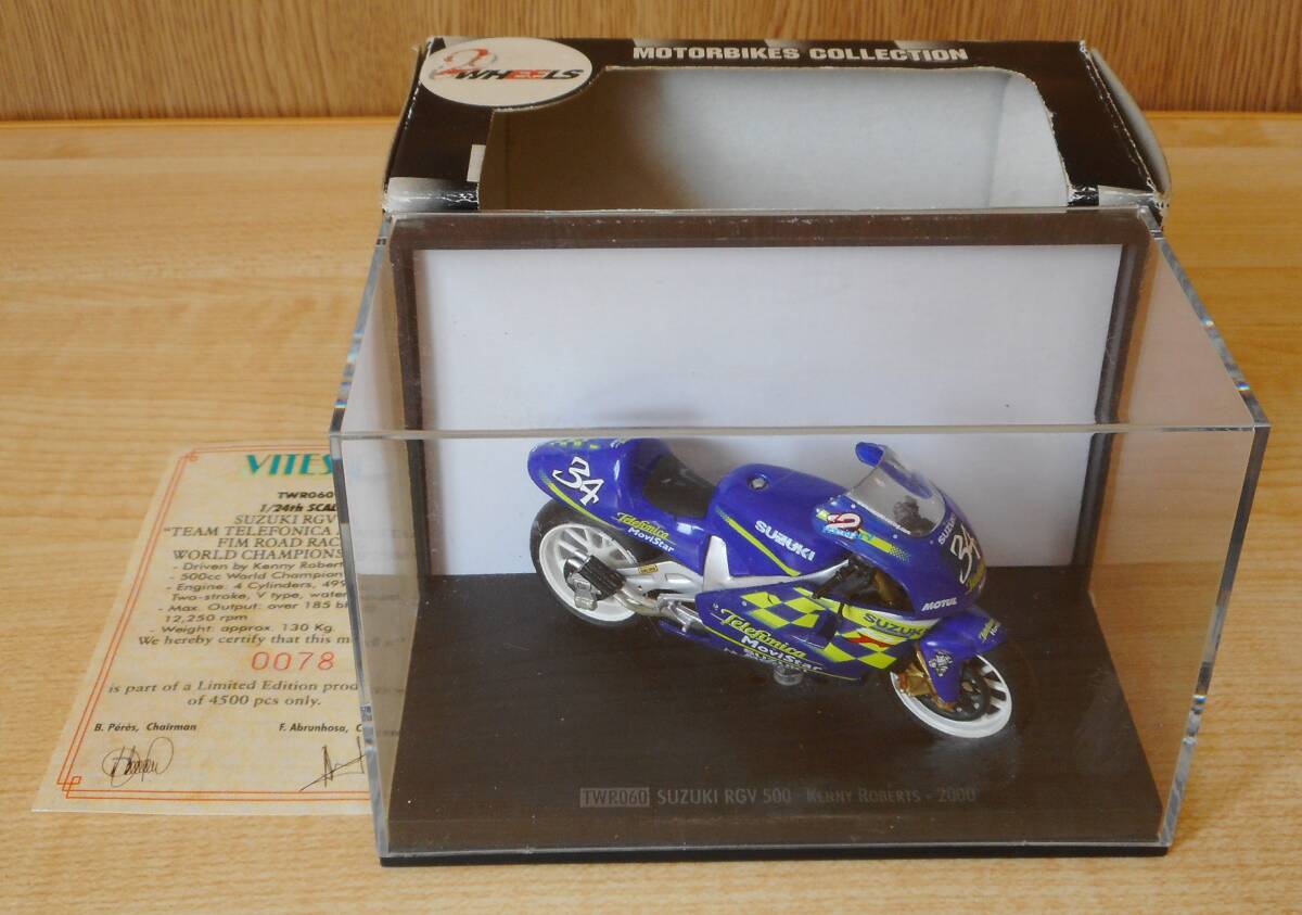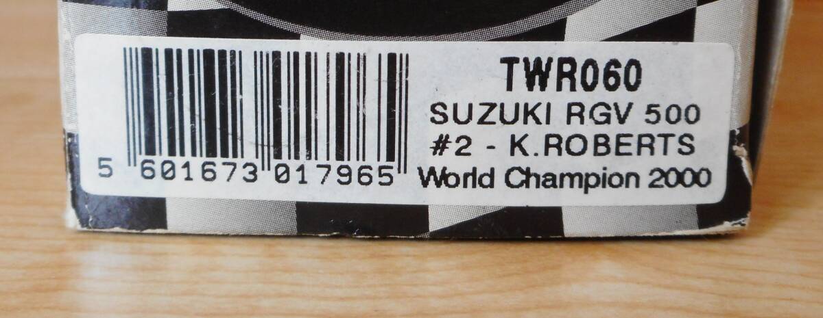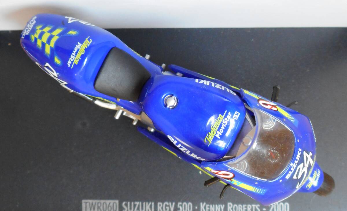 2000年のケニー・ロバーツ選手の「スズキ RGV-γ500」を1/24スケールで再現したミニカーでしたが、2000シーズン後に行われた「テスト・試乗会」でシュワンツが行ったデモ走行仕様に改造しています。