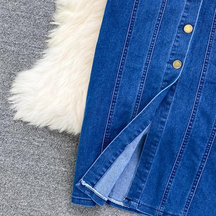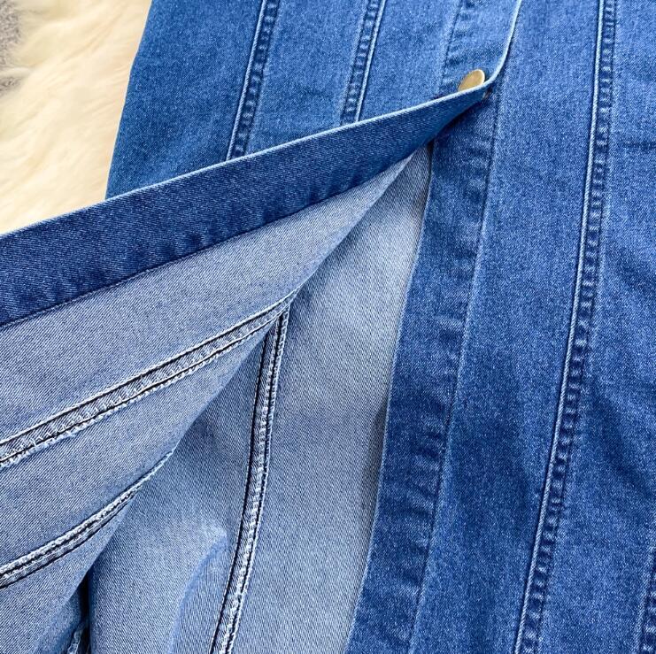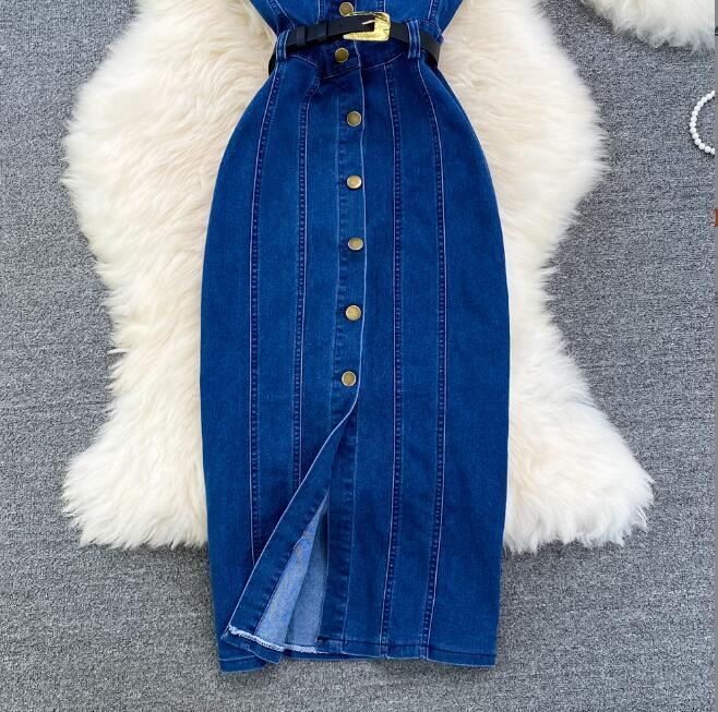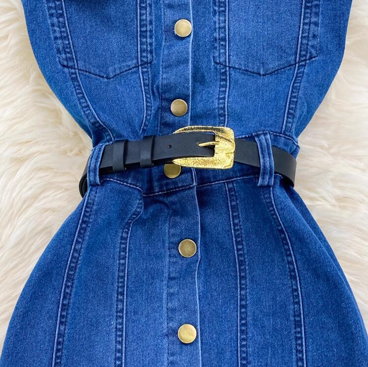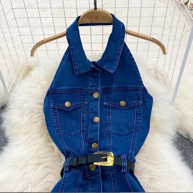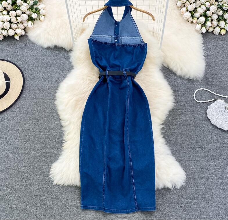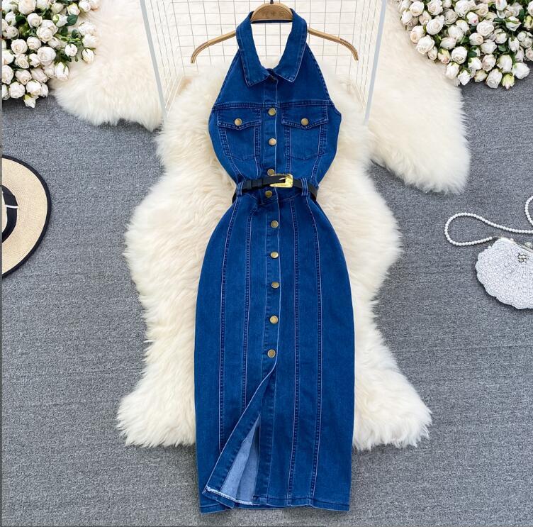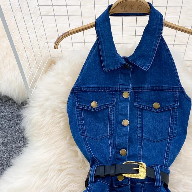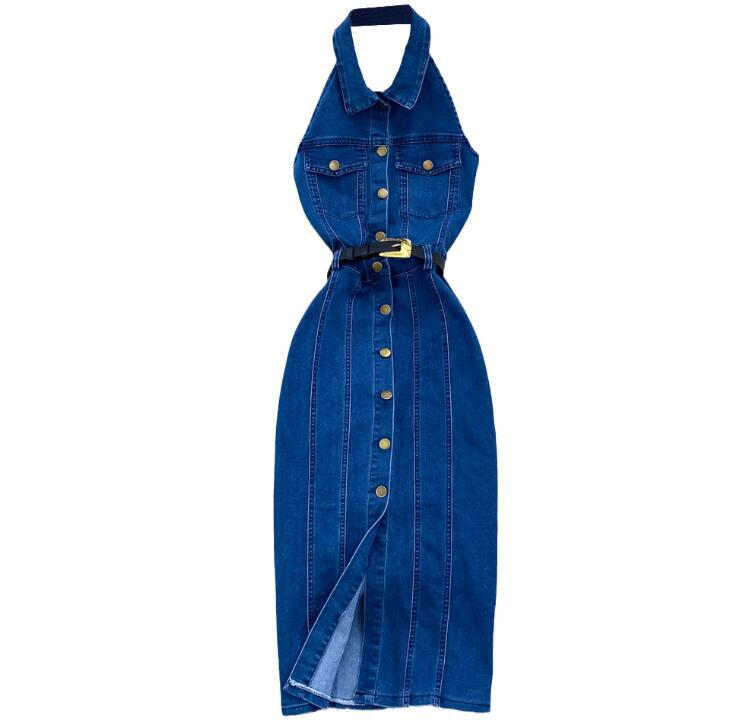 大人気ミディアム丈ワンピース ひざ下丈ワンピース デニムワンピース ジャンパースカート ノースリーブ 袖なし L ブルー