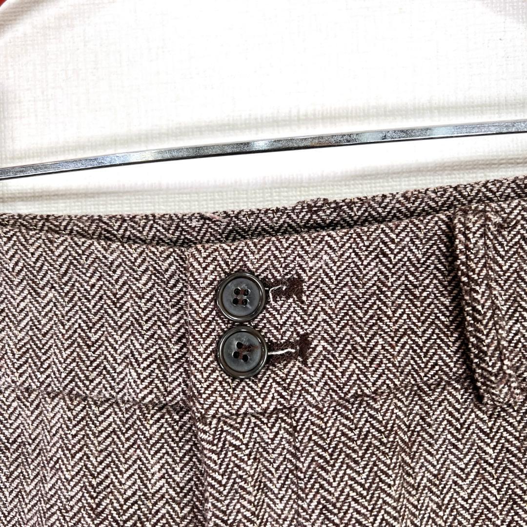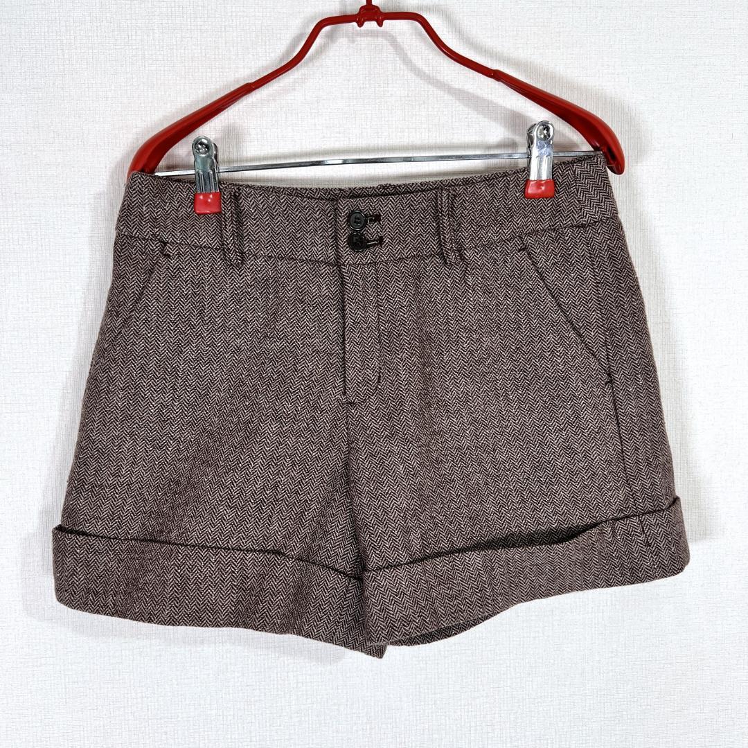 女性用のブラウン系のヘリンボーン柄ショートパンツ ズボン ボトムスです。上品でカジュアルな印象を与えます。中古品ですが目立つような傷や汚れもなく、まだまだ使っていただけます。古着 ヒアーズ イトキン株式会社