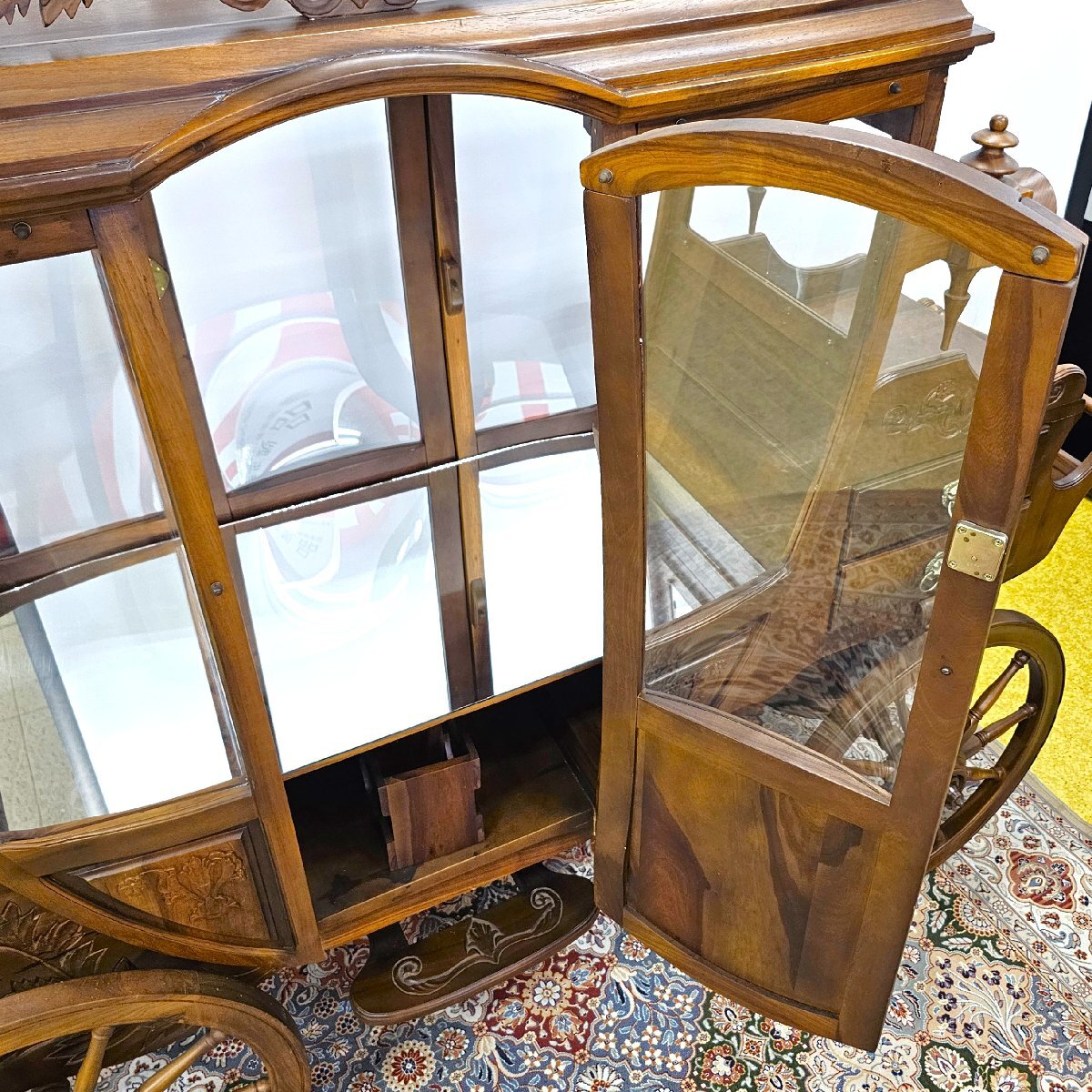 | 商品状態 | 【状態】 中世ヨーロッパの優美な雰囲気を漂わせた木製で作られた馬車の飾り棚です。 無垢材を削り出し、細部まで装飾にこだわった非常に美しいお品です。 この機会にぜひご検討ください。 経年劣化によるゆがみや若干の角の欠けなどありますが十分飾ってお楽しみになれる商品コンディションかと思います。 ホルダーもありますのでワインラックとしてもご利用いただけるかと思います。 扉部分はアクリル製で、左右両扉に鍵がありますが片側の鍵が固着しており解錠できませんでした。 現状お渡しですので、鍵や気になる箇所などの整備はご落札者様にてお願いいたします。 完璧な美品ではありません。商品状態を強く気にされる方は入札をご遠慮ください。 店頭でも販売しておりますのご興味が有りましたらぜひお越しになり、現物をご確認ください。 ※状態については主観的なものですので神経質な方は入札をご遠慮ください。 ※商品画像につきましては、お使いのディスプレイや、カメラの性能、光の加減などにより写り方に違いが出る場合がございます。予めご了承ください。  |
