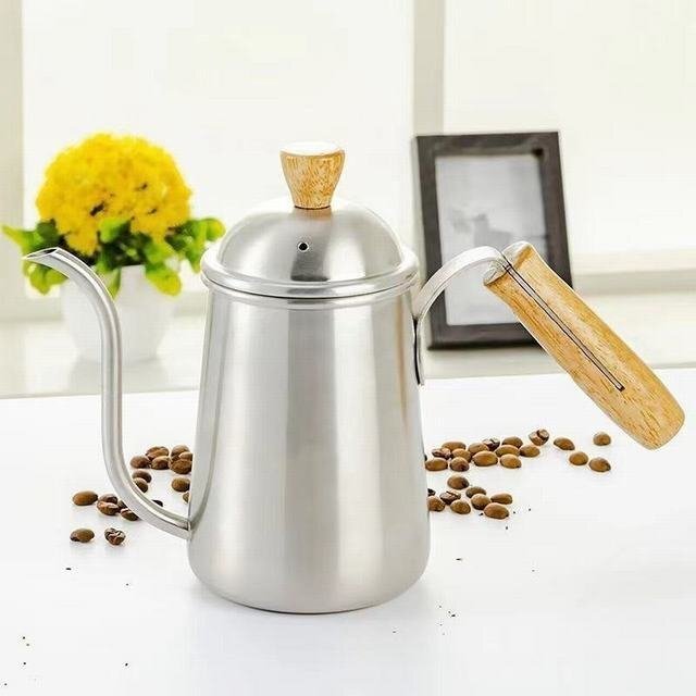 サイズ(約):高さ16.5cm 底部9.5cm 素材?材質:ステンレス鋼 ドリップポット:満水容量/650ml、本体板厚/0.8mm、本体艶消し、ハンドル取っ手とつまみが木製仕様