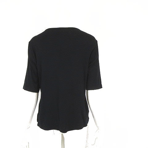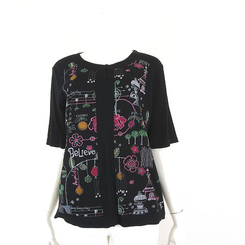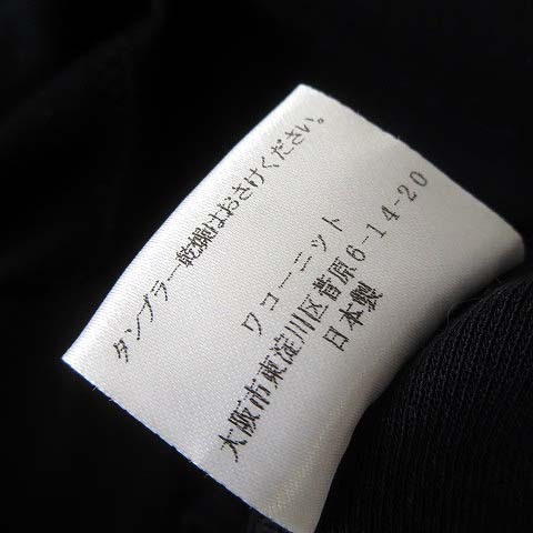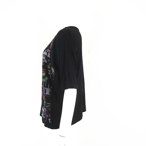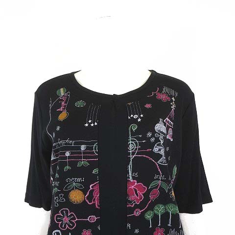 ワコーニット 日本製 トップス カットソー 花柄 総柄 プルオーバー 5分袖 半袖 M-L 黒 ブラック マルチカラー レディース