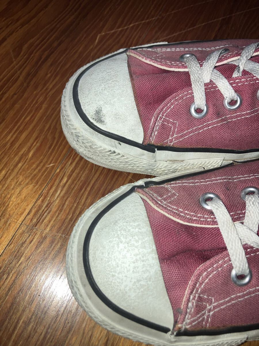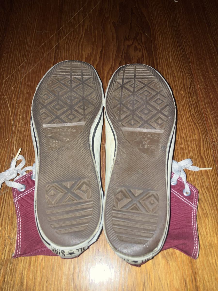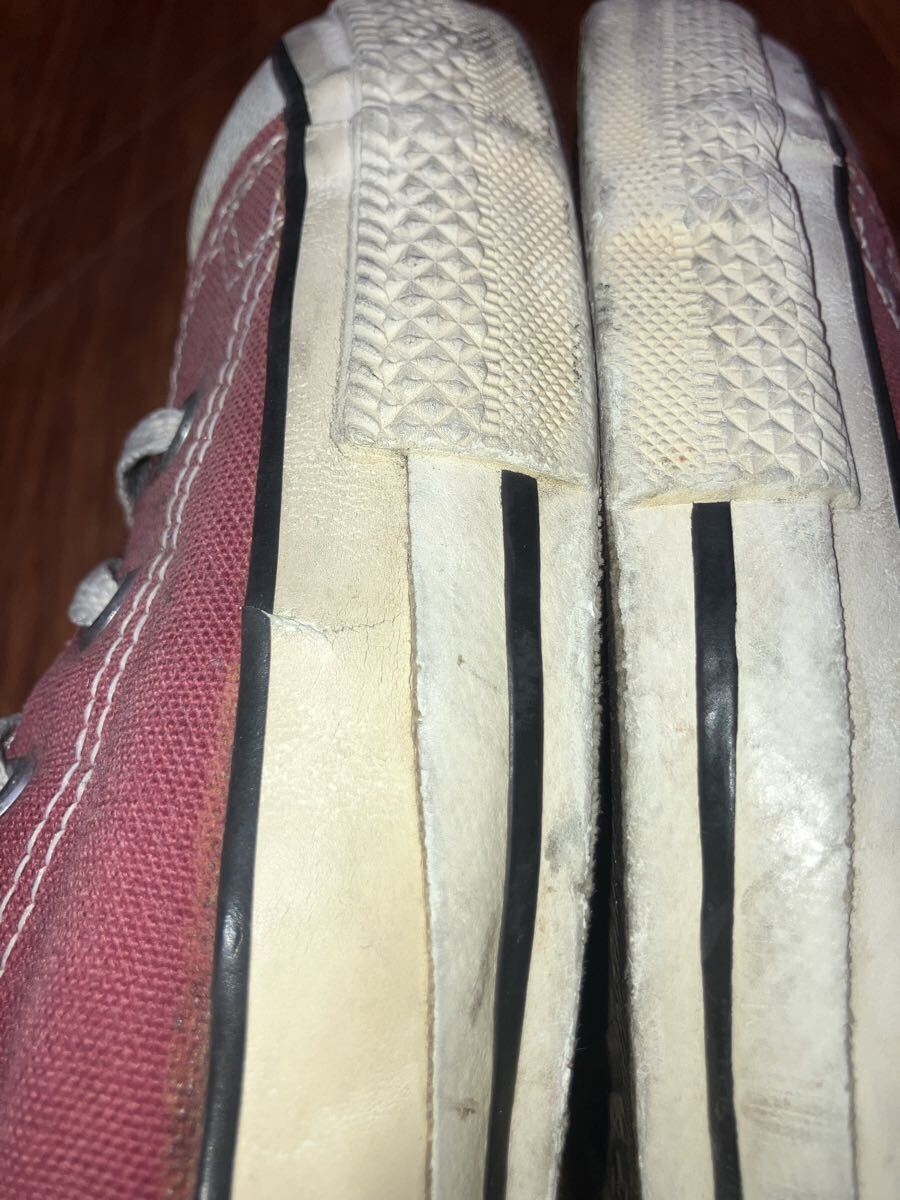 えんじ色?が色落ちしていい色になっていると思います。赤が色落ちなのかも知れません。サイズが大きいですがデカ履きする方にはいいかもしれません。