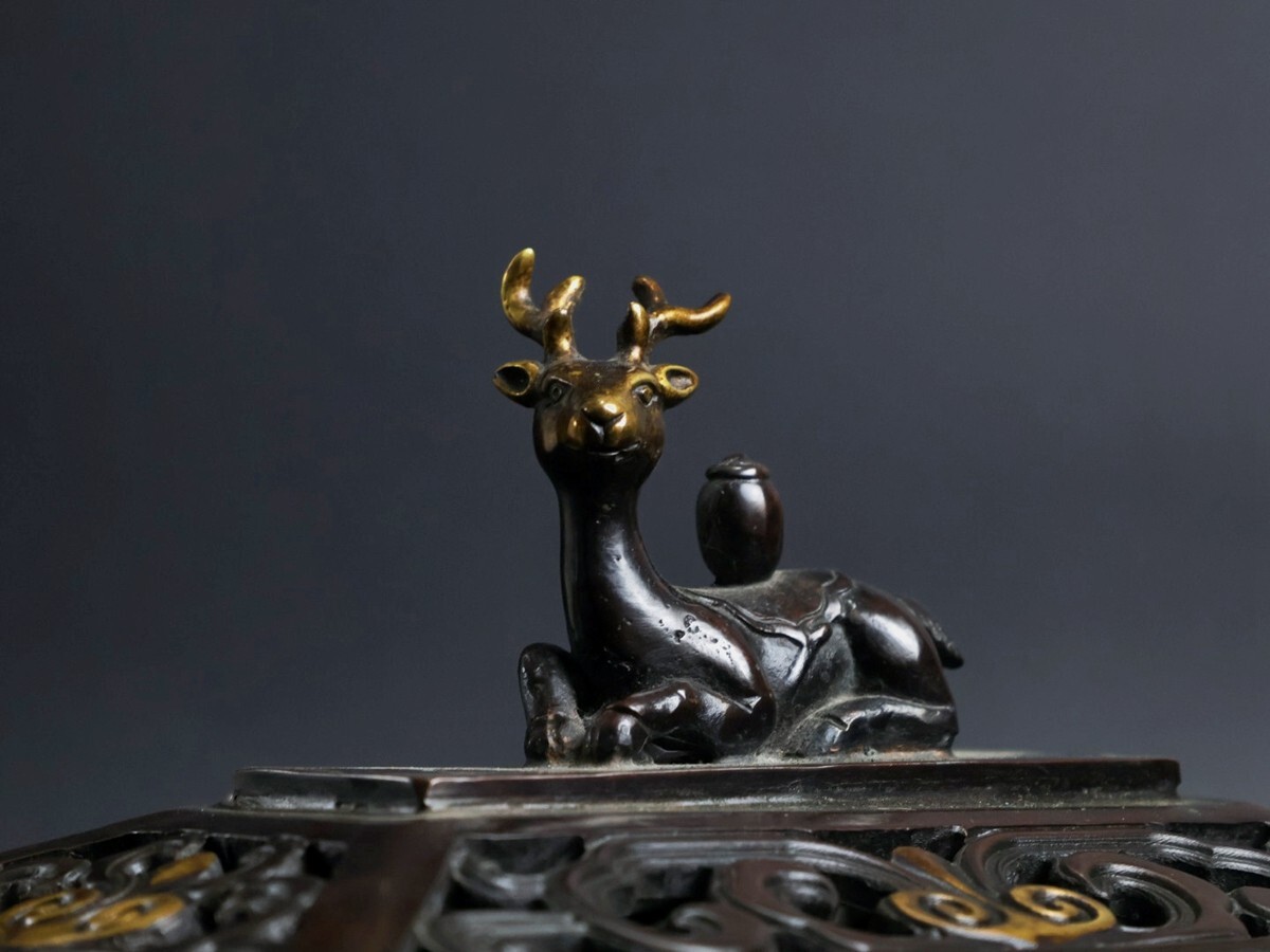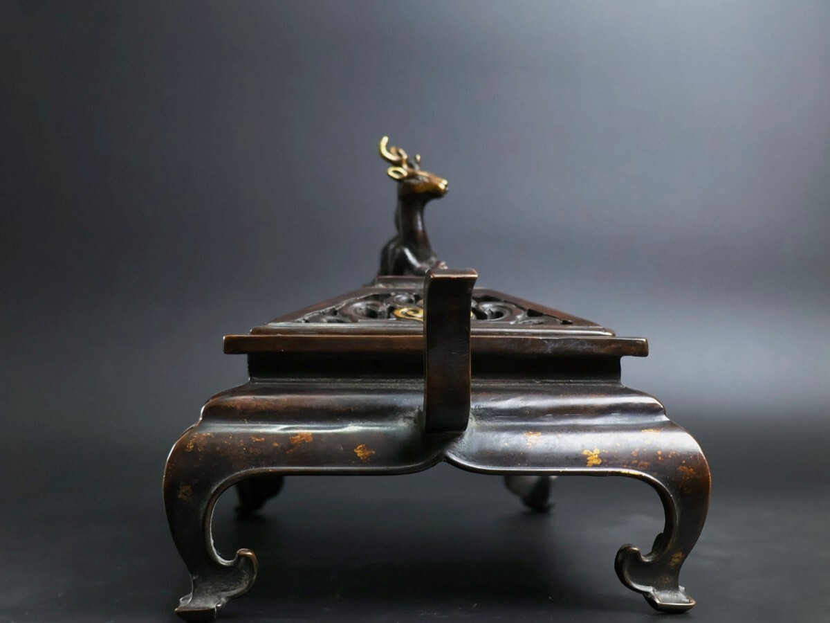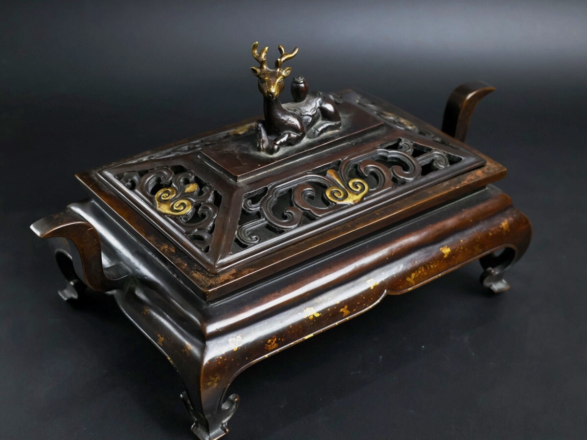 「明代 大明宣徳年製 古銅彫 灑金朝冠耳老銅香薰炉」旧銅器 置物擺件 賞物 中国古美術 旧蔵出