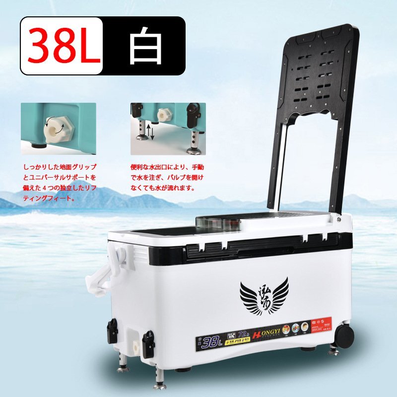 釣り用クーラーボックス 38L 大容量頑丈ボディ 保温保冷 ハンドル/釣りエサ箱/背もたれ/水栓付き 釣り 防水 白 hw702wt