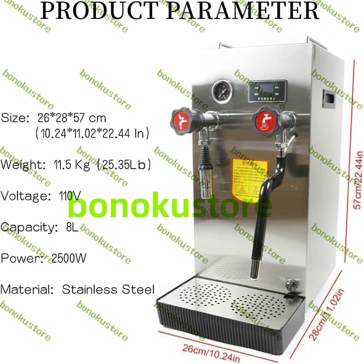 この自動スチーム沸騰水機を使用すると、給湯器、蒸気エンジン、ミルクフォームマシンを同時に使用できます。特徴:1. 優れた放熱性2. 中空設計、安定していて変形しません3. 高級でエレガントな外観4. 内蔵カップウォーミング機能がより配慮されています製品仕様:製品名: スチームミルク泡立て器材質: ステンレス定格電力: 2.5Kw定格電圧: 110-220V定格容量: 8L本体サイズ: 260X280X570mm梱包リスト:業務用ミルク泡立て器 x 1水道管 x 1ウォーターボックス x 1注:1. 上記の寸法すべて手作業で行われ、若干の誤差が生じる可能性があります。2.ご質問がございましたら、いつでもご相談ください。満足のいく回答をさせていただきます。