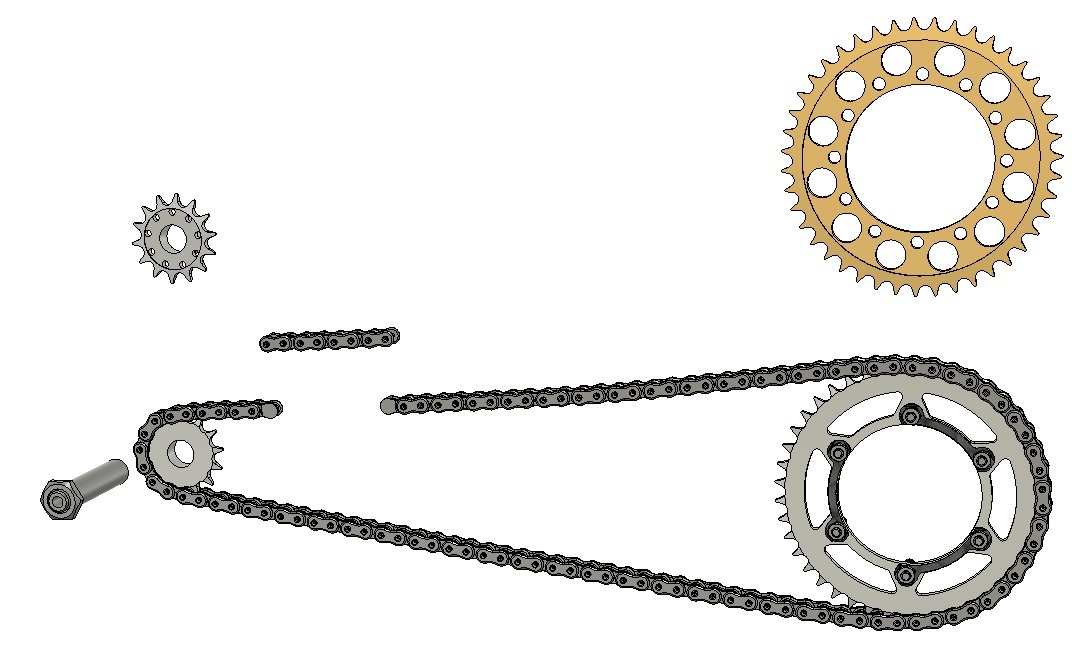 1/12チェーン、スプロケット、チェーンカバーを3DCADで設計、3Dプリンターで出力したものになります