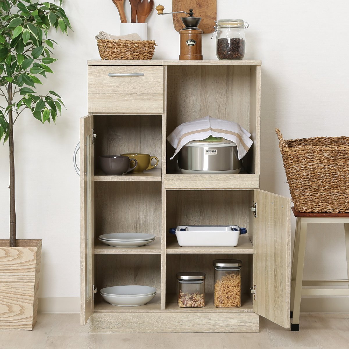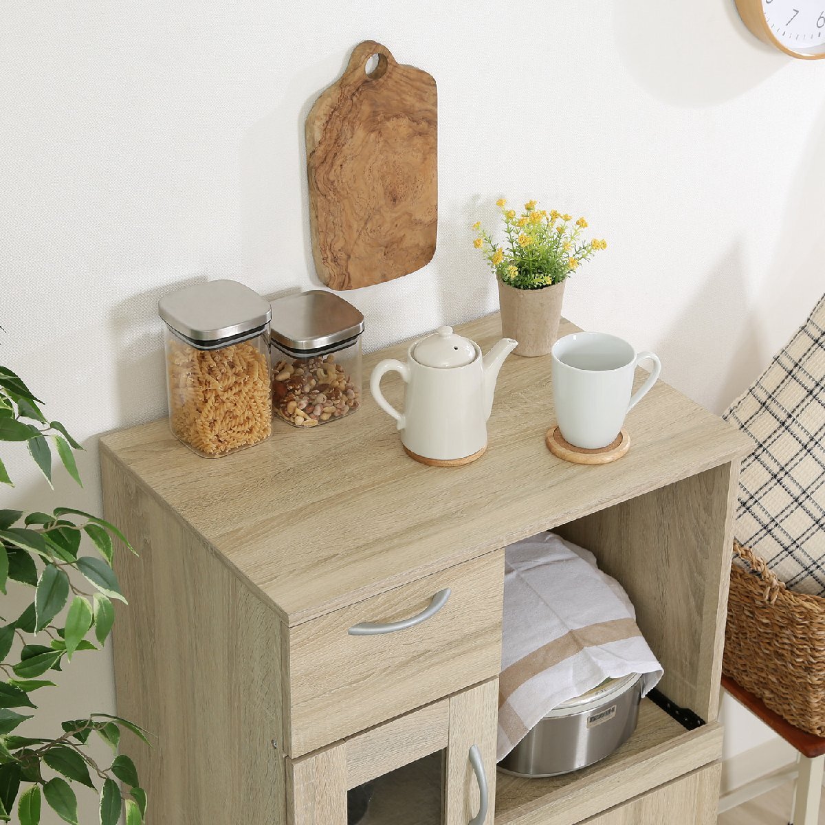 備 考 | ■リビングボードとしても使えます。 ■炊飯器や食器収納に便利なキャビネットです。 ■おしゃれな木目調カラーです。 |