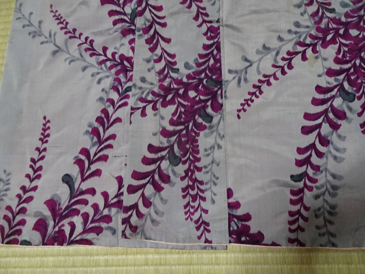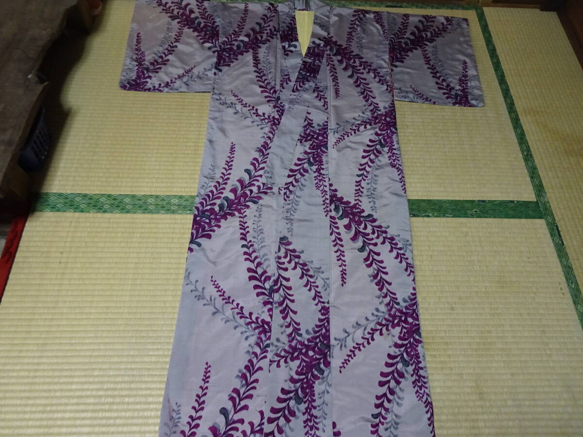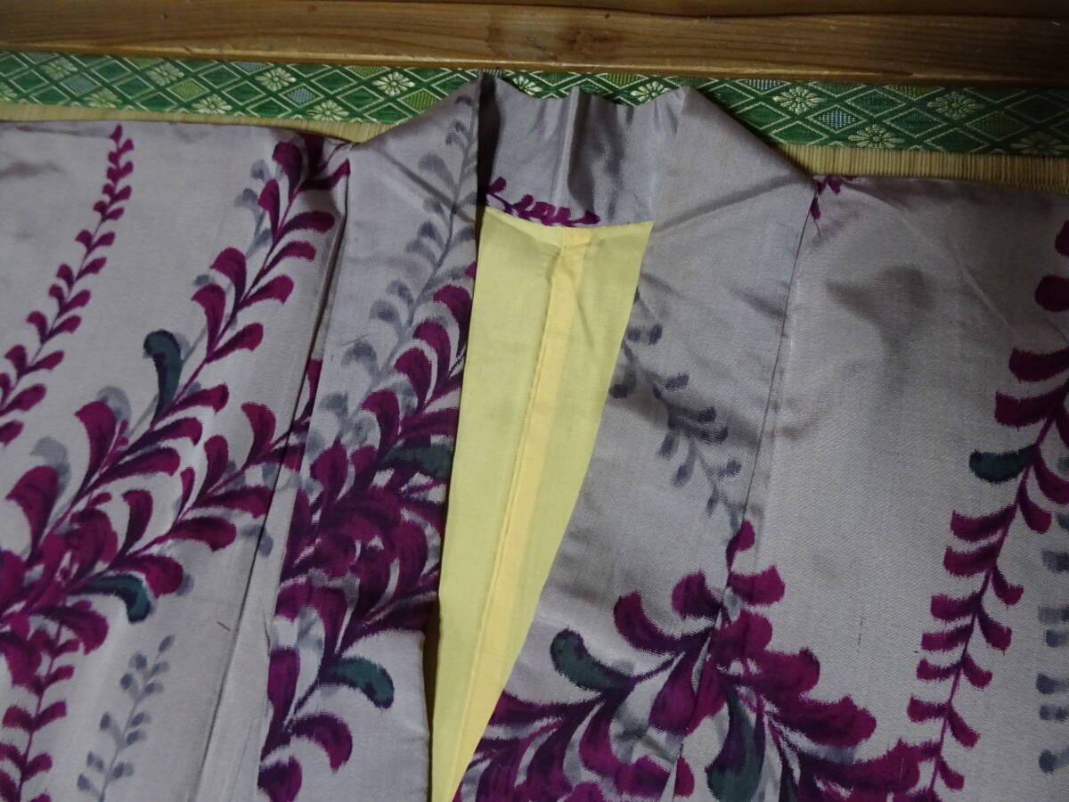 左前身頃の下方に小さな薄汚れ(写真5参照)と右後ろ身頃上部に小穴(写真6参照)が一カ所見られますので素材用に出品します。裏地は黄色の木綿、八掛けもピンクの木綿です。参考までに裄丈は約62,5cm、身丈は約149cm、袖丈は約45cmです。出品しております商品は中古品やアンティーク品です。充分点検しておりますが、僅かな見落としがある場合はご容赦下さい。また、色合いも忠実に再現できない場合もありますのでご理解下さい。完品をお求めの方や匂いが気になる方、神経質な方のご入札はお控え下さいませ。また、いかなる理由があっても入札後の取り消しには応じられませんので慎重なご入札をお願い致します。24時間以内にご連絡頂ける方、3日以内に入金頂ける方のご入札をお待ちしております。お取り置きは10日位までお受け致します。