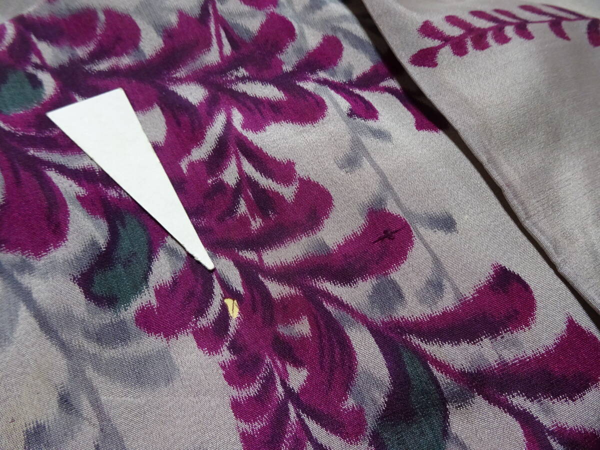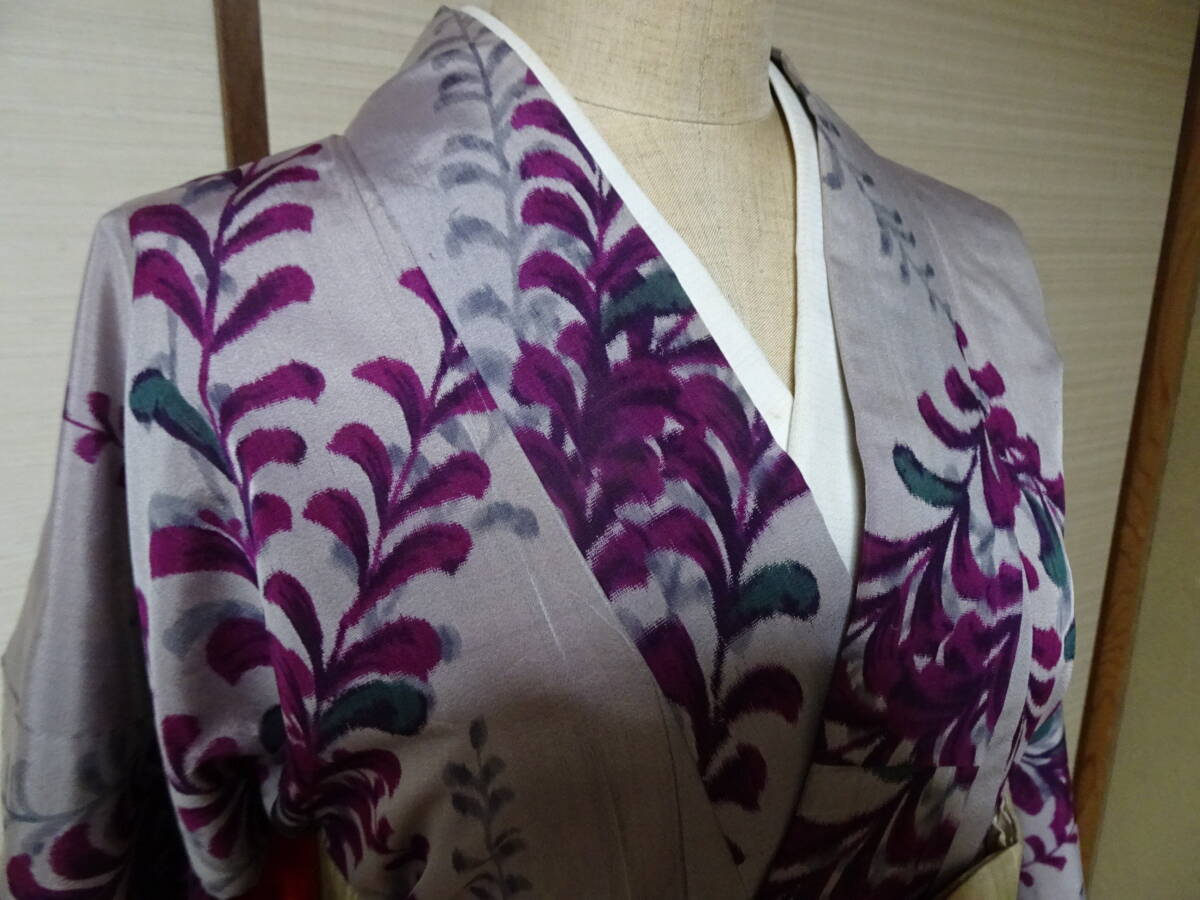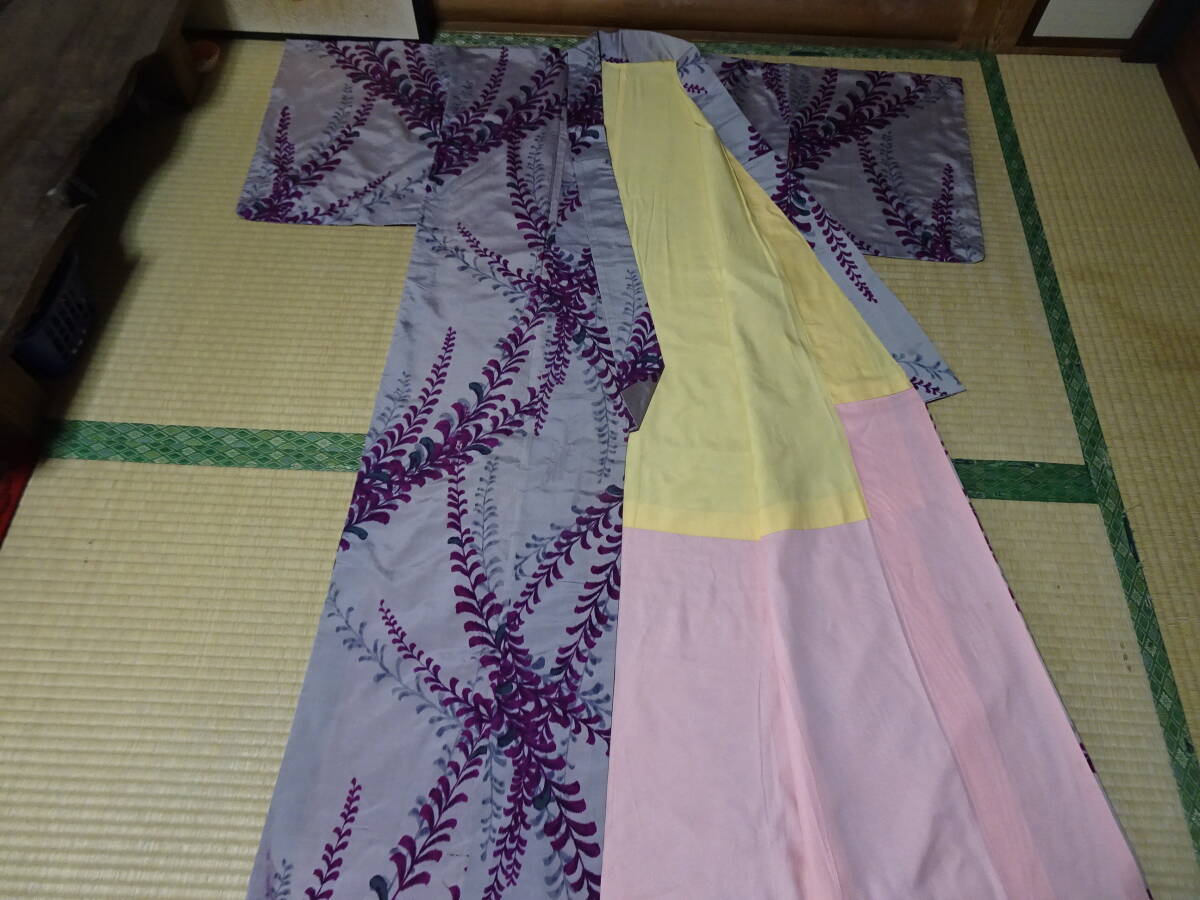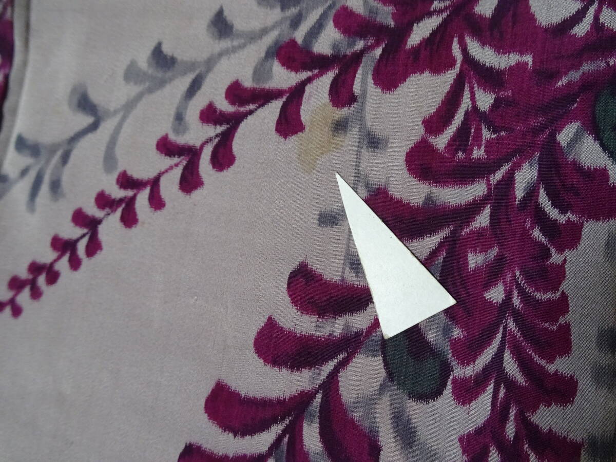 左前身頃の下方に小さな薄汚れ(写真5参照)と右後ろ身頃上部に小穴(写真6参照)が一カ所見られますので素材用に出品します。裏地は黄色の木綿、八掛けもピンクの木綿です。参考までに裄丈は約62,5cm、身丈は約149cm、袖丈は約45cmです。出品しております商品は中古品やアンティーク品です。充分点検しておりますが、僅かな見落としがある場合はご容赦下さい。また、色合いも忠実に再現できない場合もありますのでご理解下さい。完品をお求めの方や匂いが気になる方、神経質な方のご入札はお控え下さいませ。また、いかなる理由があっても入札後の取り消しには応じられませんので慎重なご入札をお願い致します。24時間以内にご連絡頂ける方、3日以内に入金頂ける方のご入札をお待ちしております。お取り置きは10日位までお受け致します。