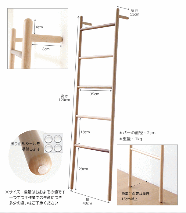 | 天然木のスタイリッシュな 家具や小物シリーズは ナチュラルな天然木の使用で シンプルなデザインと無垢の温もり、 機能性を持ったお勧めのインテリアです 壁に立てて使う はしご型のハンガーは移動も楽らくで ショールやベルトなど ちょっと掛けて置きたい小物に とても重宝します 商品名 : ナチュラルウッドのラダーハンガー(map-7263) 全体サイズ(cm) : 幅40×奥行10.5×高さ120 ハンガーの幅 : 約34.5cm ポールの直径 : 約2cm 材質 : オーク ブナ ウォールナット 重量 : 約1kg 生産国 : ベトナム ※付属の立てかけ棒を取り付けてご使用ください ※天然木は一つ一つ違いがあります。 木目や節等は木の表情として予めご了承下さい。 ※裏部分のくりぬき穴が僅かに、欠けているものもあります。 ご使用等には差し支えはございませんので予めご了承ください。 |