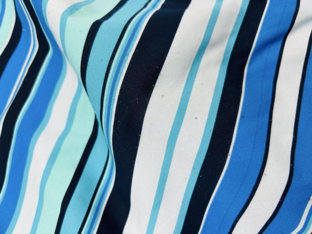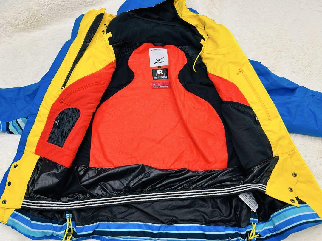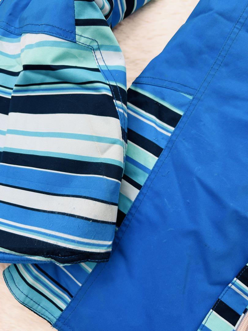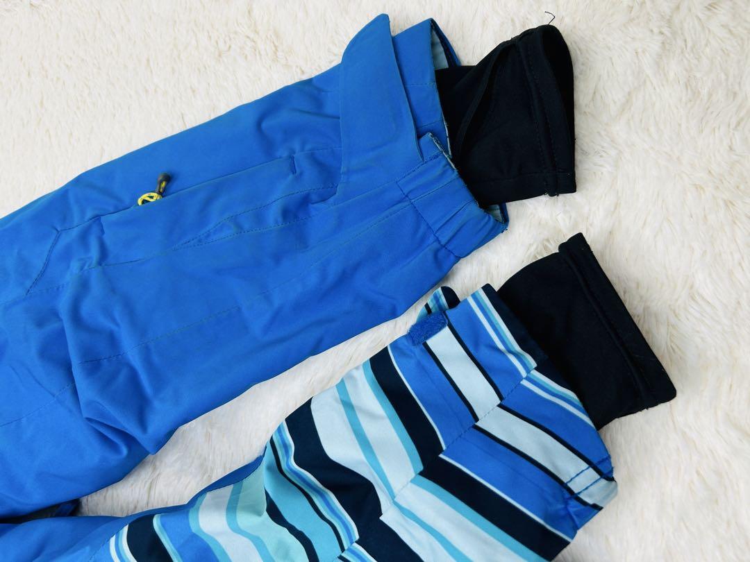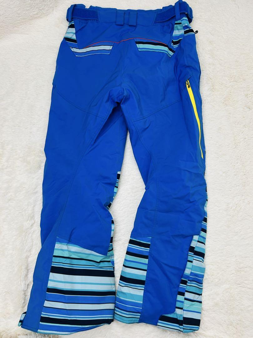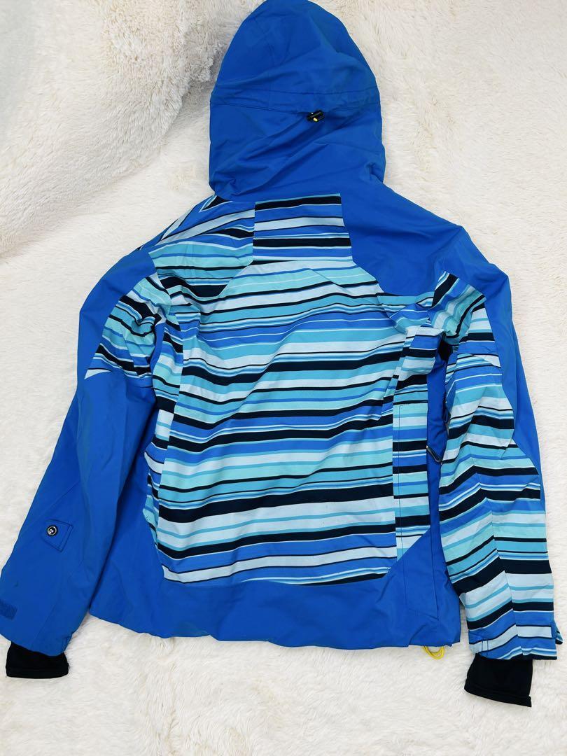 鮮やかなブルーを基調にしたストライプ柄が爽やかさを演出し、アクセントのイエローとレッドがスポーティで活気ある印象を与えます。雪山の白い背景によく映え、スタイリッシュな存在感を放つデザインです。