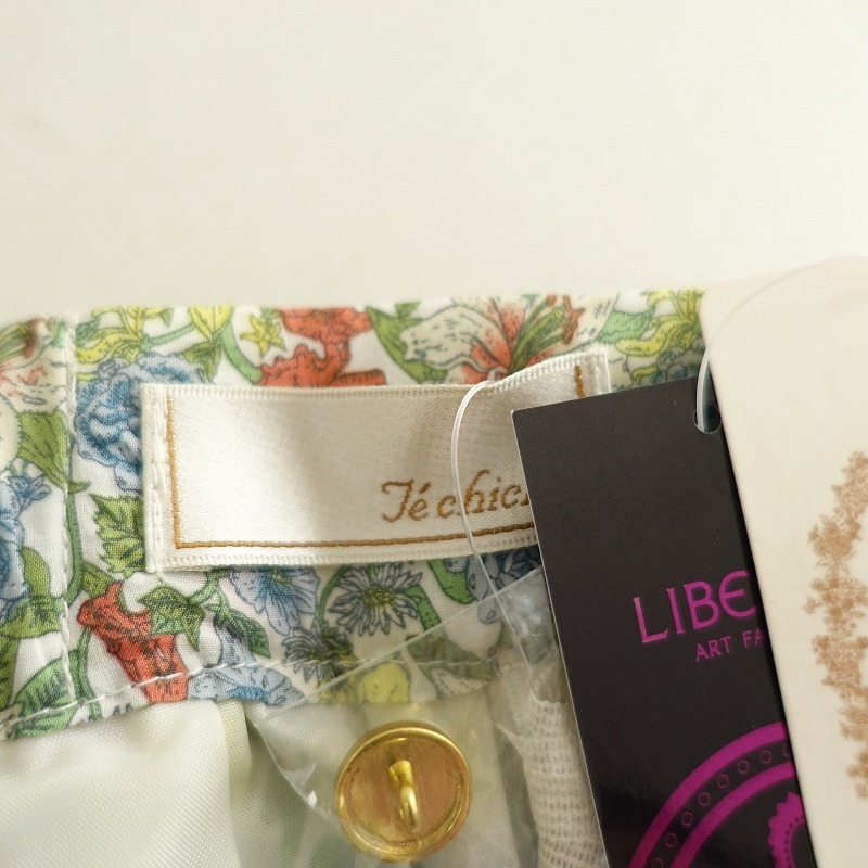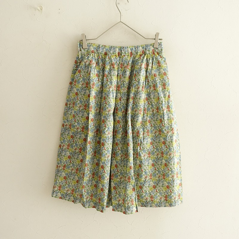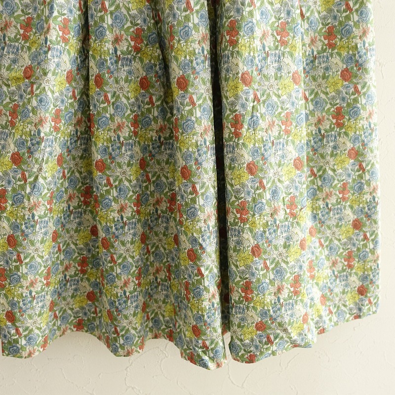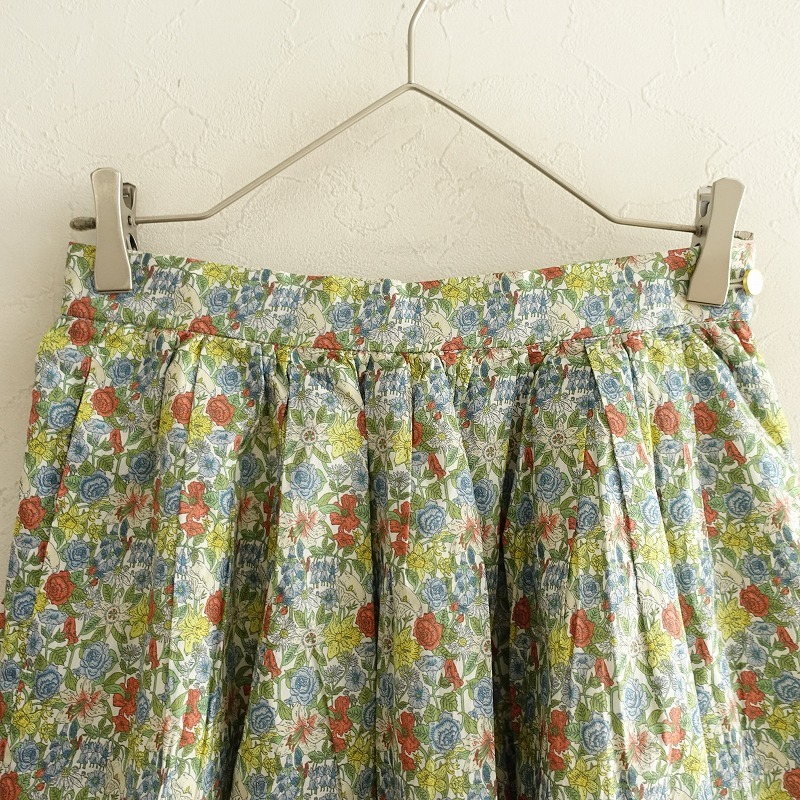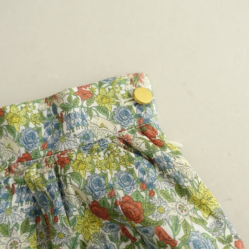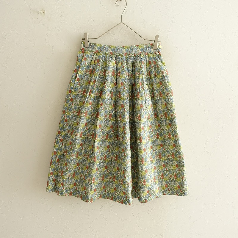 | Te chichiのLIBERTY タナローンフラワー柄スカートです。カラーはホワイトベースに、ブルー系・イエロー・ライトグリーン・オレンジ等の花柄プリントのタナローン地で仕立てられており、裏地が付いております。バックウエストはゴム入り、左腰のボタン&ファスナー開閉で着脱でき、右サイドにシームポケットが付いております。 |