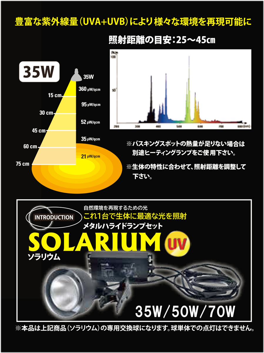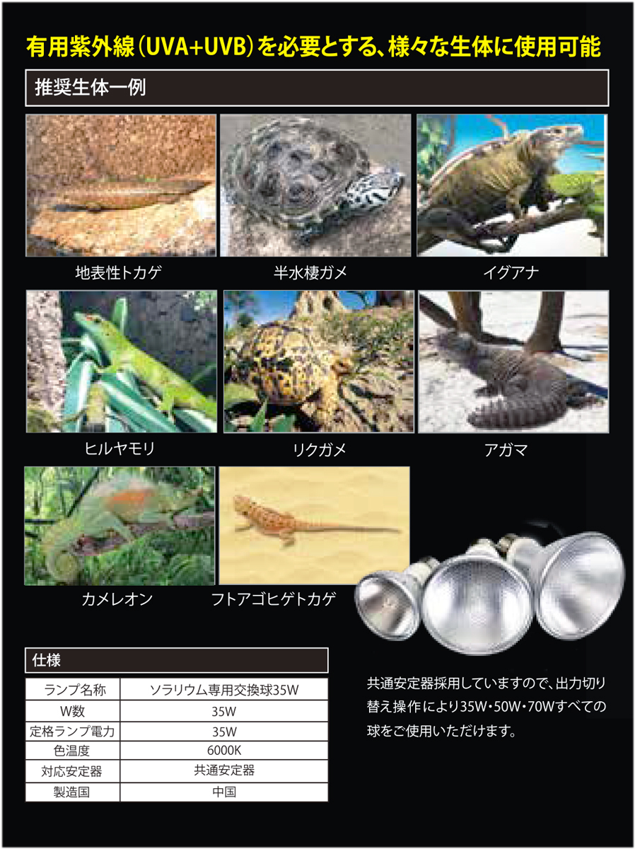 この商品を点灯することができるソラリウムセットは安定器に切り替えスイッチがあり、ソラリウムの交換球35W/50W/70Wに対応していますので、違うワット数のセットをお持ちのお客様でも専用交換球ならば交換することが可能です。暑い夏又は照射距離を短くしたいときは35W、寒い冬又は照射距離を長くしたいときは70W、などといった球の交換が可能になります。