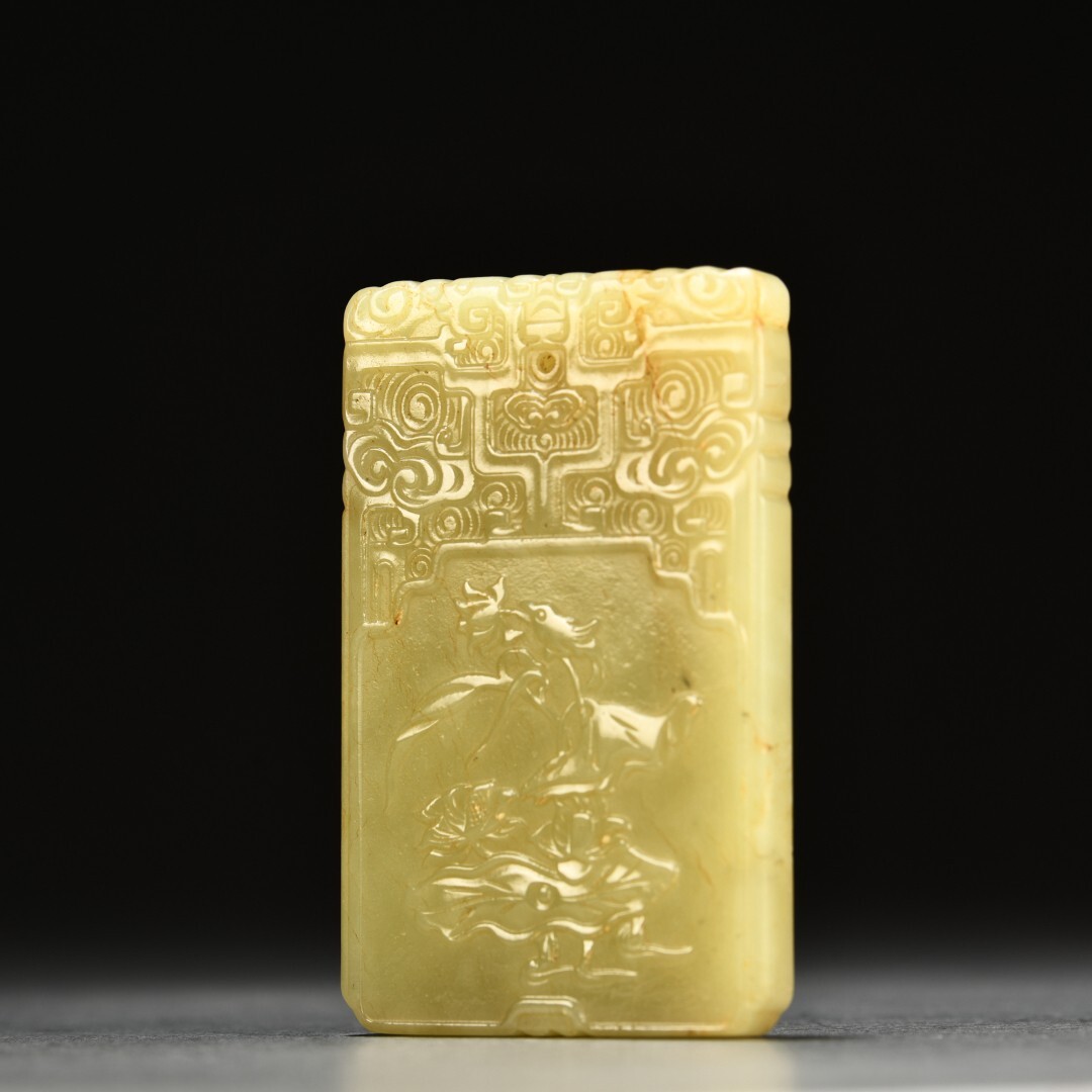 【瓏】和田玉 黄玉彫 和合二仙 玉牌 清時代 極細工 手彫り 置物 裝身具 賞物 中国古美術 蔵出