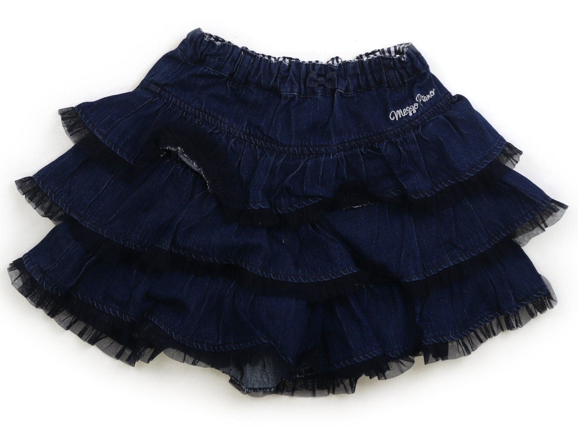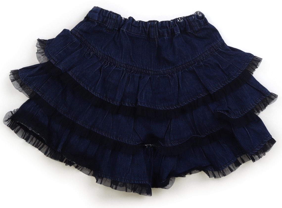 綿100%の薄手のデニム地、チュール装飾あり。ウエストはサイズ調整ゴムが付いています。洗いざらし感あり。前身頃中央に白い汚れがありますが、まだお使いいただけそうです。