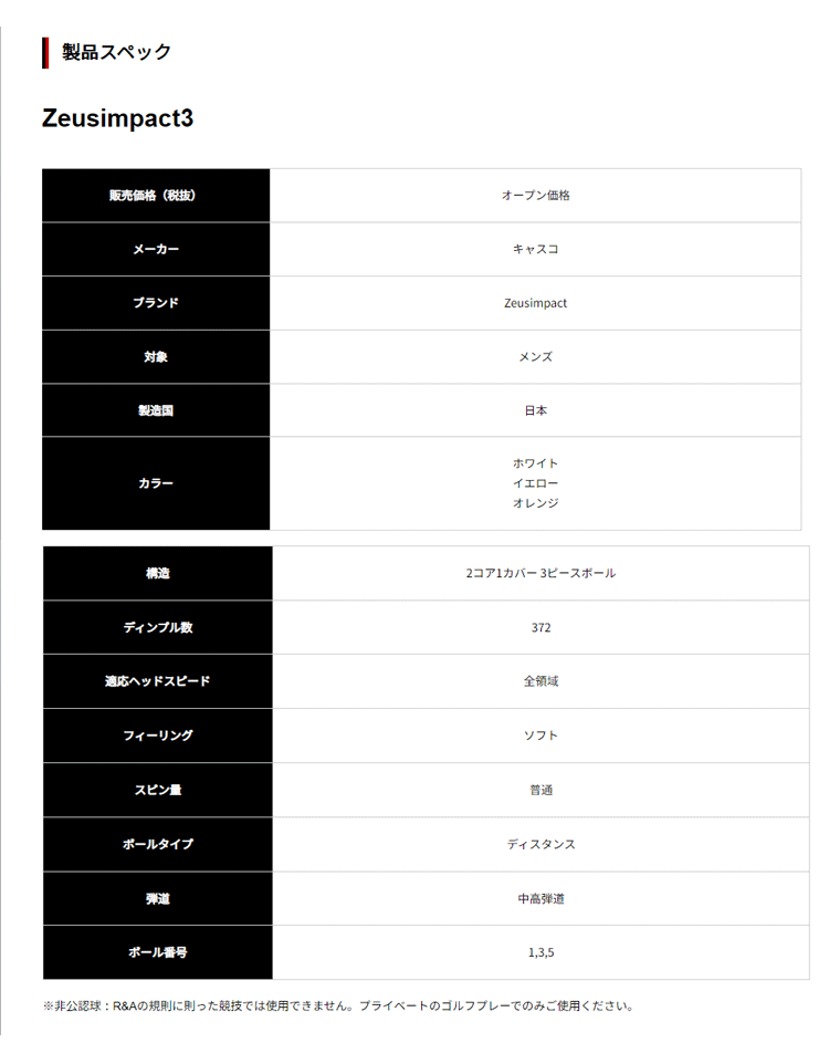 【商品特徴】 反発係数0.85で驚異の飛び!高反発+推進力=最大飛距離! ■MAXIMUM DISTANCE 公認球の規制値を大幅に超えた反発係数0.85(125ft/s)でボール初速がさらにアップ。 直進性に優れた弾道で、驚きの飛距離性能を実現。 飛距離が落ちてきたと感じているゴルファーや、もっと飛ばしたいと思っているゴルファーの武器になるボールです。 試打テストでは、適合モデルより飛距離12.7ヤードアップしました。 ■MULTILAYER STRUCTURE 2コア1カバーの3ピース構造の高反発ボールですが、高反発ボールにありがちな硬い打感のボールではなく、柔らかい打感にもこだわりました。 日本製ならではのクオリティの高いボールに仕上がっています。 ■COR 0.85 新配合の「ハイリバウンドデュアルコア」は、内柔外硬の構造で、より楽にコアが変形し、素早く復元。 「高初速カバー」との組み合わせで、従来モデルの反発係数0.845(125ft/s)から公認球の規制値を大幅に超えた反発係数0.85(125ft/s)にアップ。 ボール初速がさらに向上し、直進性にすぐれた弾道で、驚きの飛距離性能を実現します。 ■IMPROVED AERODYNAMICS 直径42mmのスモールサイズで、公認球よりも空気抵抗を2.0%低減。 アゲンストでも力強い弾道が得られます。 また、ゼウスインパクトのために新開発した「フルアクセルディンプル372」は、飛距離特性に優れ、抗力係数を約3%低減。 前へ伸びる推進力が向上しました。 「スモールサイズ」との組み合わせで、最高到達点がより遠くへ伸び、飛距離アップの喜びが味わえます。 【商品詳細】 ●状態:新品・未使用品 ●構造:2コア1カバー 3ピースボール ●ディンプル数:372 ●最適ヘッドスピード:全領域 ●フィーリング:ソフト ●スピン量:普通 ●ボールタイプ:ディスタンス ●弾道:中高弾道 ●カラー:オレンジ ※非公認球のため、R&Aの規則に則った競技では使用できません。 プライベートのゴルフプレーでのみご使用ください。 ※撮影時の光量の具合や、ご覧いただいております画面環境によりまして、実際の商品と若干色味が違う場合がございます。