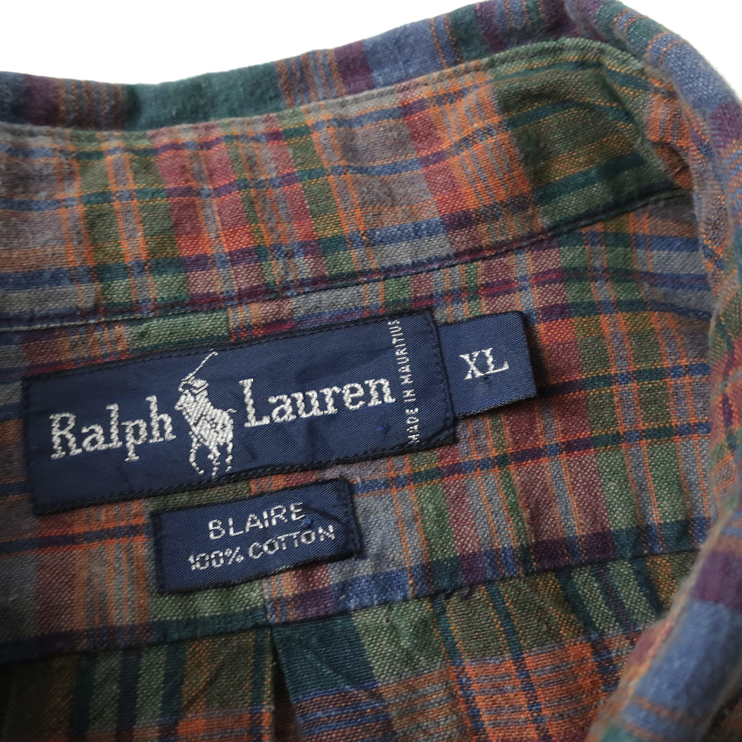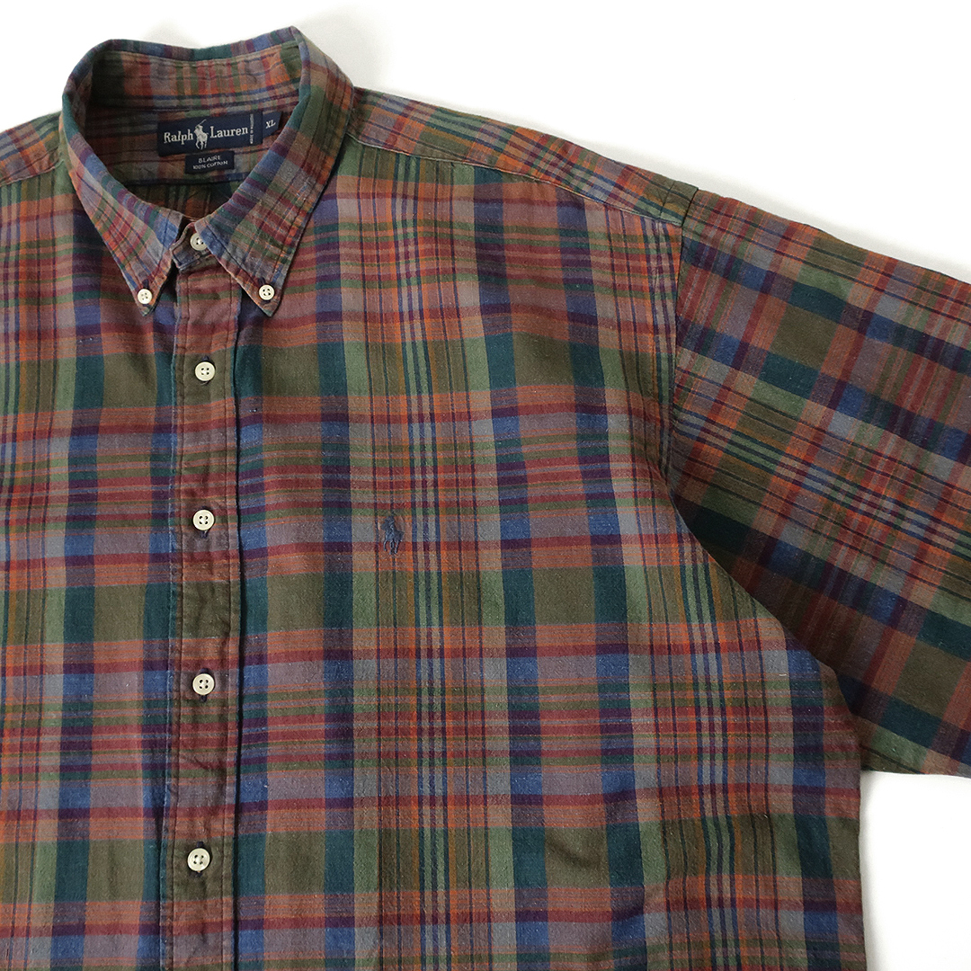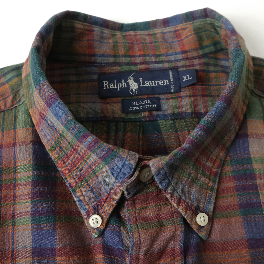 US90s ラルフローレン BLAIRE ボタンダウンシャツ ダーク系マドラスチェック/ポニー刺繍/オックスフォード生地 (XL)