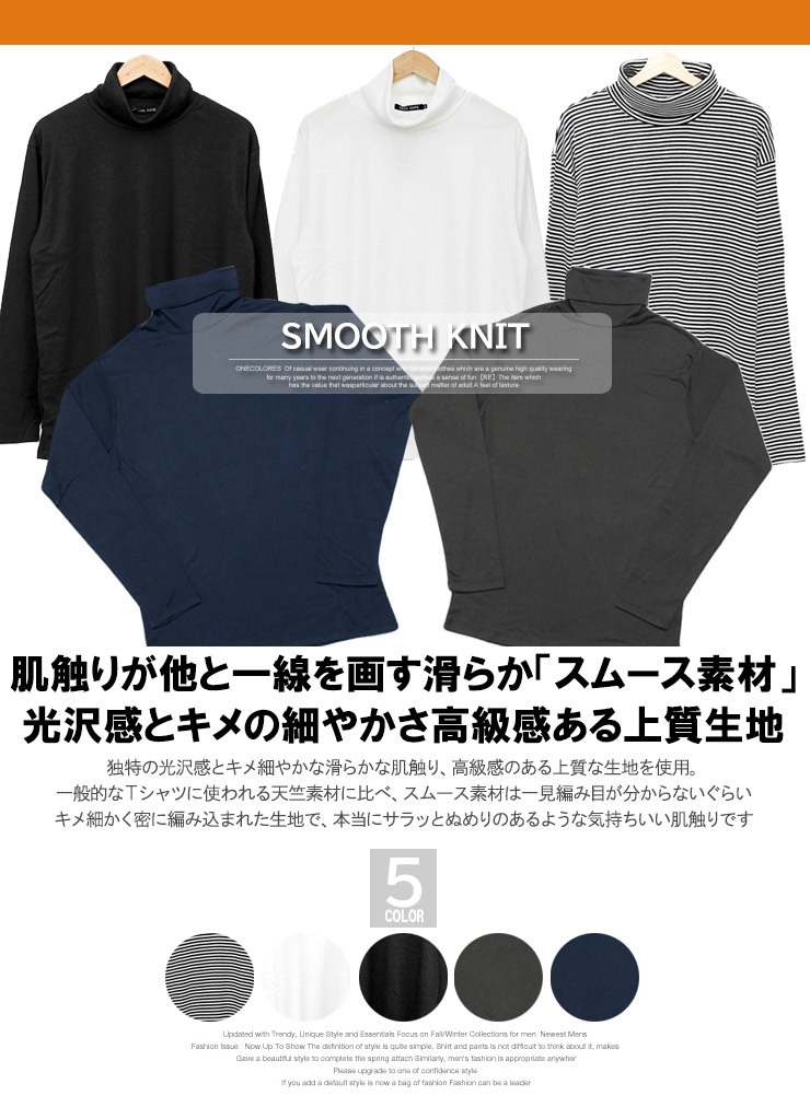商品説明 | スムース素材を使用した無地とボーダー柄から選べるタートルネックTシャツの登場です。 |