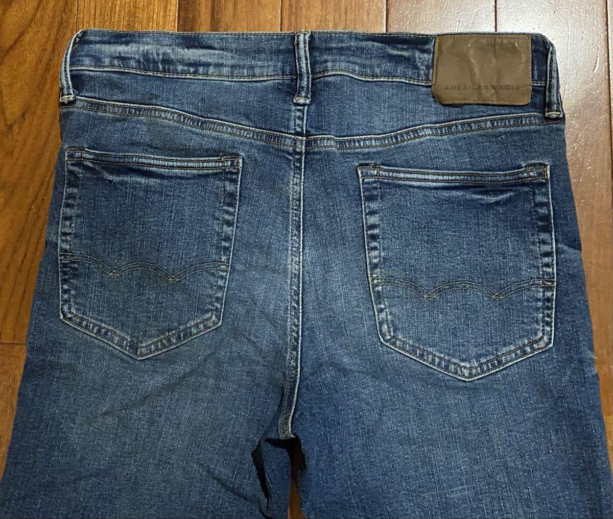 アメリカンイーグルのストレッチスキニーデニム(ジーンズ)、NE(X)T LEVE AIRFLEX SUPER SKINNYです。色はインディゴブルーです。USEDですが状態は良いです(10段階中8程度)。紙パッチ、ジッパーフライ、裾はチェーンステッチです。生地はストレッチ入りでコットン99%、ポリウレタン1%です。正規品です((株)イーグルリテイリング、ベトナム製)。サイズはW32×L30でウエストは重ねずに平置きで約79cm、ヒップ約92cm、股上約26cm、股下約74cm、股下15cmのふともも部分約46cm、裾まわり約29cm、重量約540gです。発送はゆうパケットポストになります。