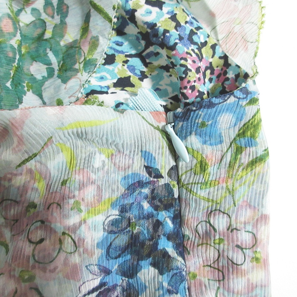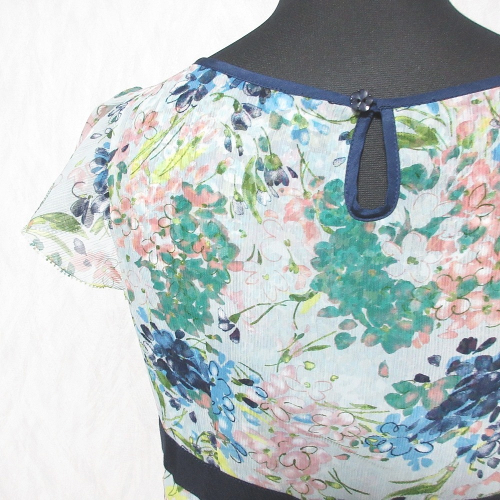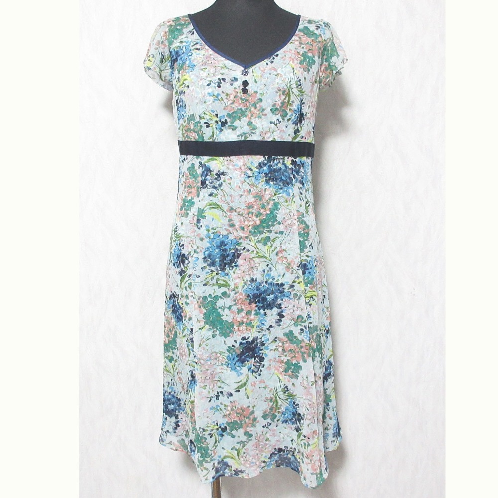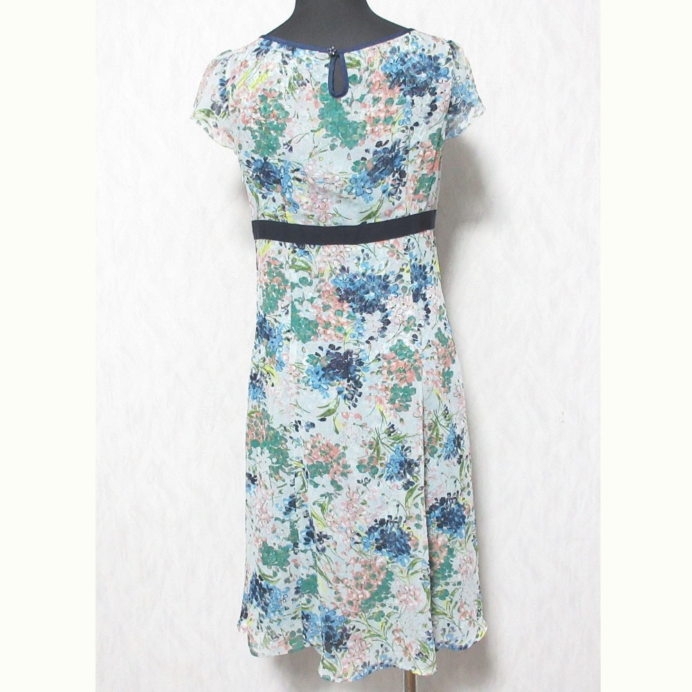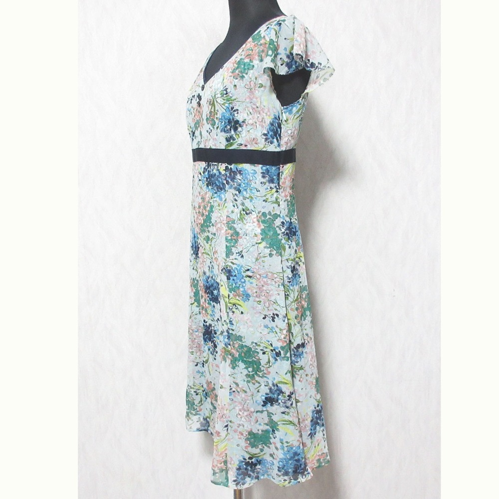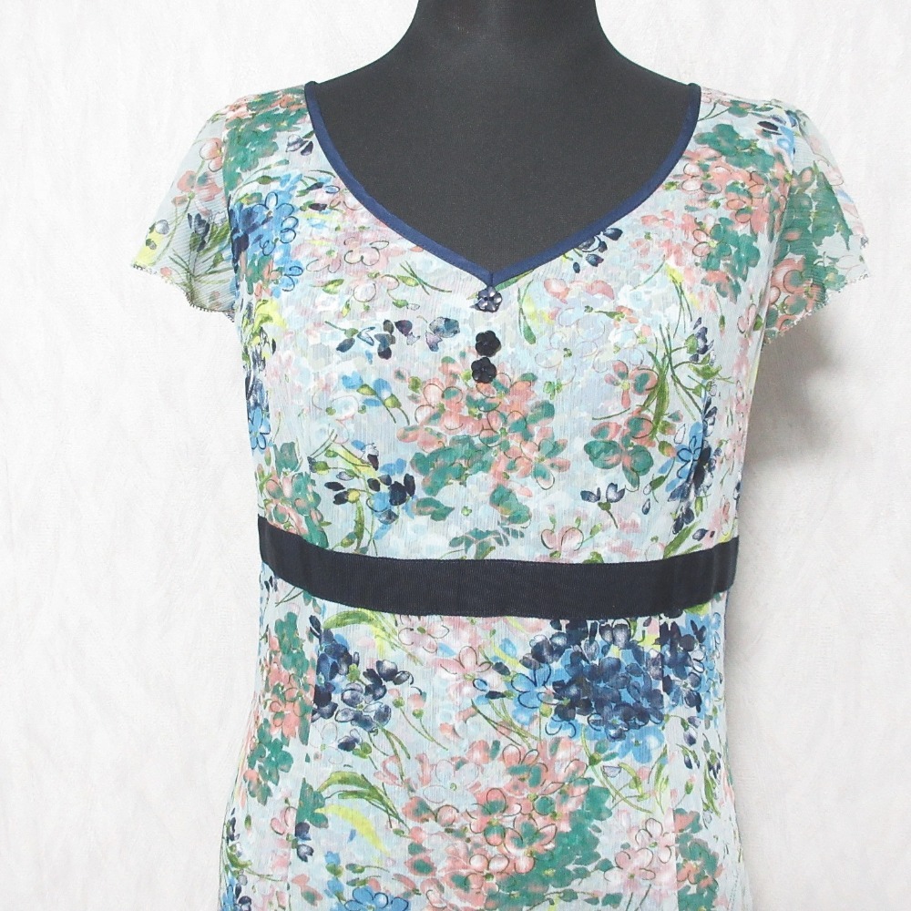 良品 TOCCA トッカ フラワープリント ショートスリーブ Vネック ひざ丈 シフォンワンピース 0 ブルー系