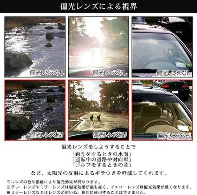 | 偏光レンズ、調光レンズを使用したカジュアルなサングラス。 【偏光レンズ】 路面や水面や雪面のギラつきをはじめ、自動車やビルのガラスからくる眩しい反射光などをカットして、視界をクリアにするレンズです。 単にまぶしさを軽減するサングラスとは違い、レンズとレンズの間に特殊なフィルターを挟みこむことで紫外線や反射光を除去し目に優しい自然光だけを通す働きがあります。 付属の偏光テスター付き。 【調光レンズ】 調光レンズとは、紫外線の量によってレンズの色の濃度が変化するレンズです。 屋内などの紫外線が当たらない場所では色の薄いレンズに戻ります。 メガネとサングラスを掛け替える手間が無く、1本で2通りの活躍をします。 サングラス中央に紫外線を感知すると即座に濃い色味へと変化します。 屋内、お出かけ、運転、釣り、ゴルフ、登山などあらゆるシーンで活躍してくれるサングラス。 ※ご覧のモニターやプラウザの設定、照明等により、画像と実物の色合いが、若干異なる場合が御座います。 ※製造上の過程により商品によっては細かな傷がある場合が御座います予めご了承下さいませ。 ■サイズ:(約)レンズ横5.3cm×縦3.8cm(フレーム含む4.5cm)、フレーム横幅14.4cm (実寸計測につき誤差はあらかじめご了承ください) ■素材・レンズ・フレーム:プラスチック ■可視光線透過率:25% ■紫外線透過率:99.9%以下 ■付属品:偏光テスター、専用ケース ■新品・未使用 | |