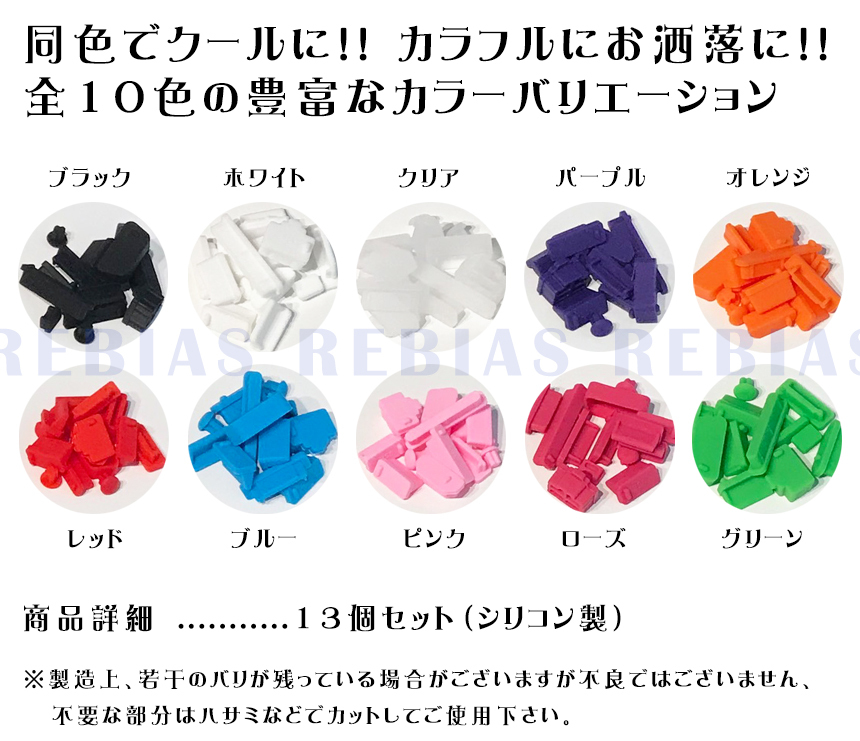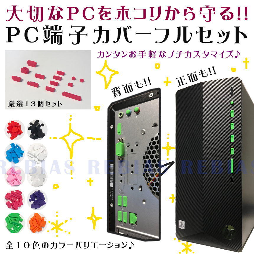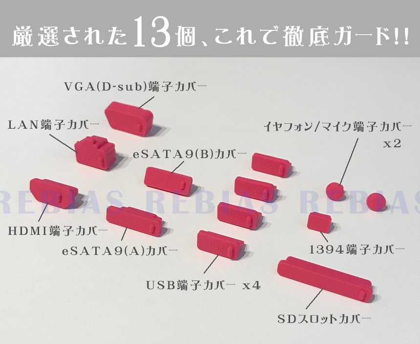 こちらのカラーは 【レッド】 になります。 パソコンユーザーなら一番困る気づいたら入ってるホコリ!端子の穴は最も気になるところですよね、、、そんな端子を根こそぎカバー!PC端子カバーフルセット13個USB、HDMI、VGA、LAN、イヤフォンジャックなど、使っていない端子は徹底的に塞いじゃいましょう!これでホコリが入る心配なし!シリコン製なのでPCを傷つける心配も無用♪全10色でちょっとした見た目のカスタムにも一役買います♪パソコンの所有台数分は買っておいて損なし!