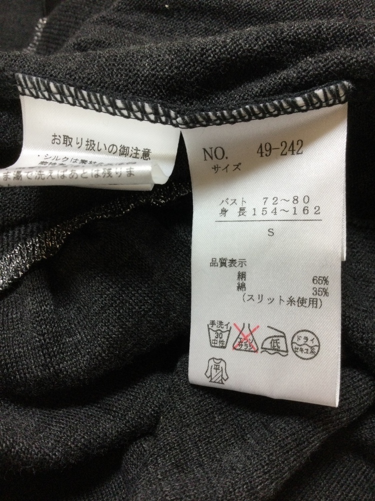 このお品は春夏向けです。 表示サイズS、バスト72-80、身長154-162 絹65%、綿35% スリット糸使用 |