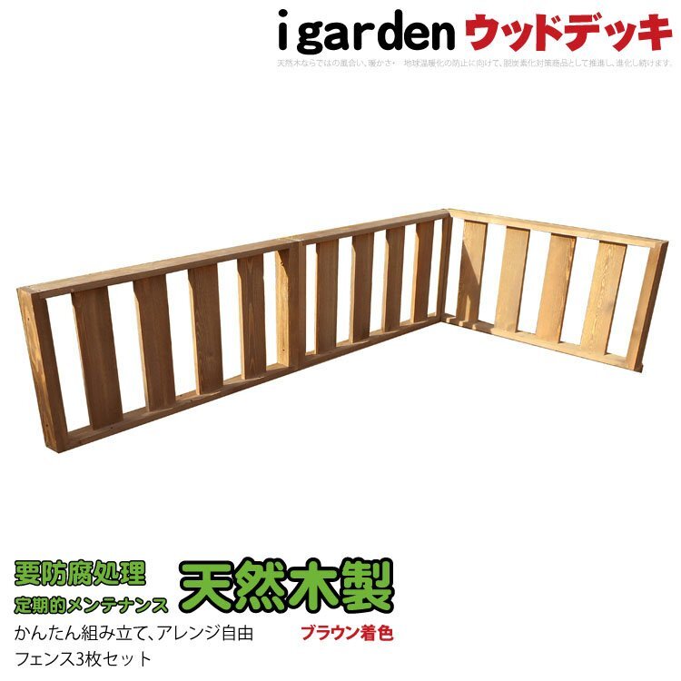 igarden 天然木製 デッキフェンス コーナー・延長 3枚セット ブラウン 手すり