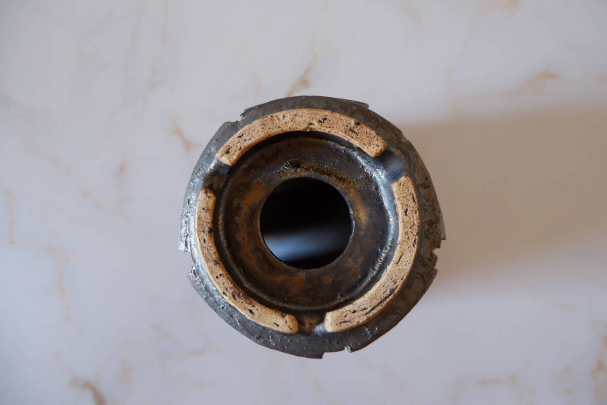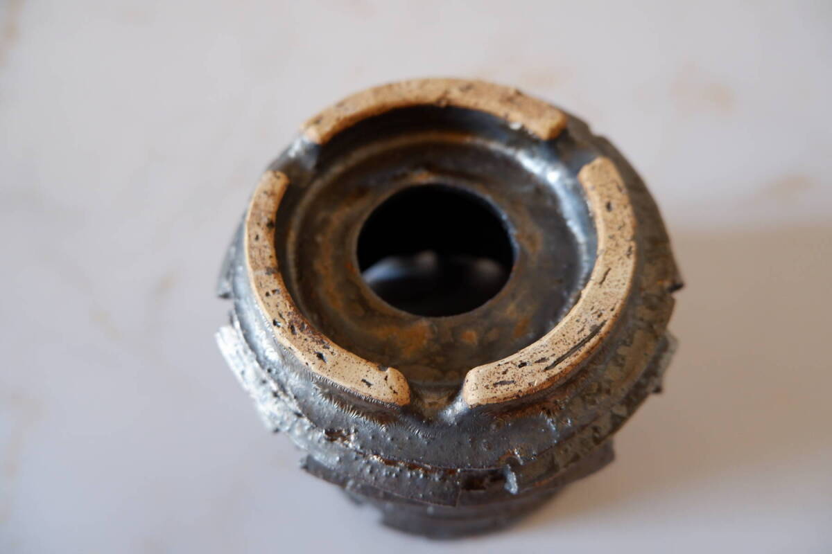 縁の溝など釉薬が溜まった個所はブロンズ色に発色していますが、全体的には鉛筆の芯のような渋い光沢を帯びた黒色です。