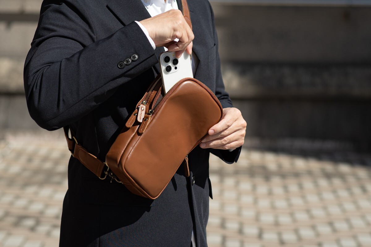 収納は3室構造で、中央のメインポケットと前後のサブポケットを備えています。メインは長財布や文庫本、スマートフォンをまとめて入れられ、内側の仕切りで鍵や小物も整理可能です。サブポケットは中身が動きにくく、スマートフォンなど薄い物を入れるのに適しています。背面には切符や小銭などを素早く出し入れできるフラットポケットも備えています。