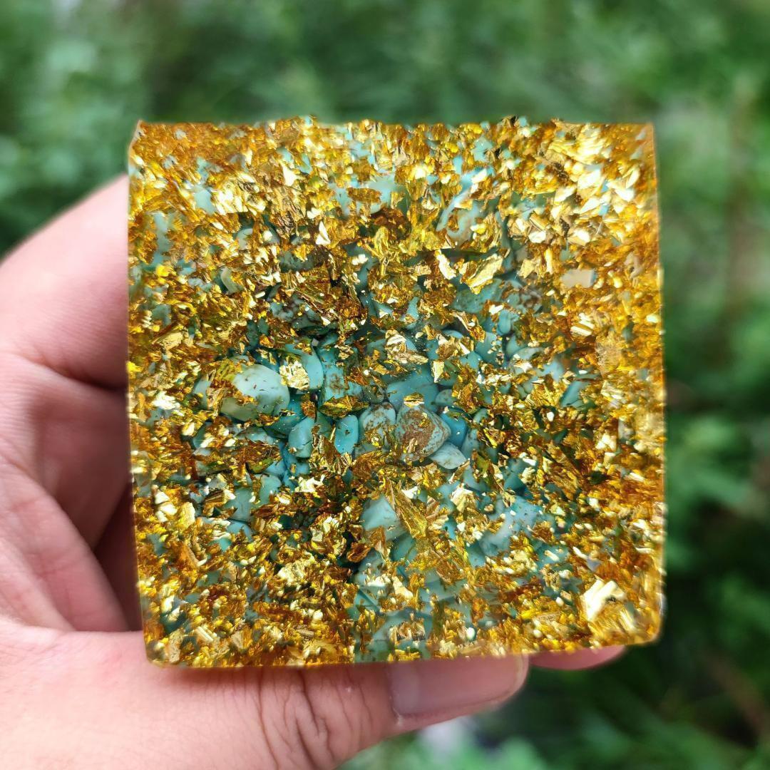 オルゴナイトとは自然界に存在する生命エネルギーを吸収し、ポジティブなオルゴンエネルギーを発生するものです。 金運、魔除け、 霊感、健康など持っている人のチャクラに作用しエネルギーを高めていきます。とても癒やされる高級感のあるインテリアです。