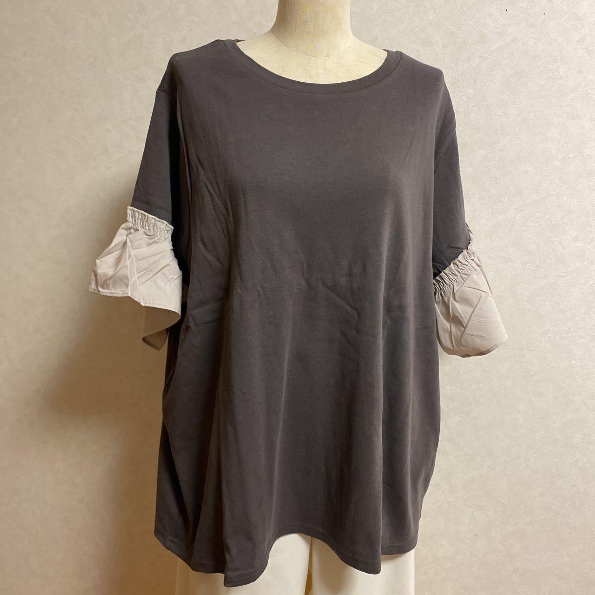 KN1424 *4L 大きいサイズ オーガニック、コットン、切替、プルオーバーチャコール